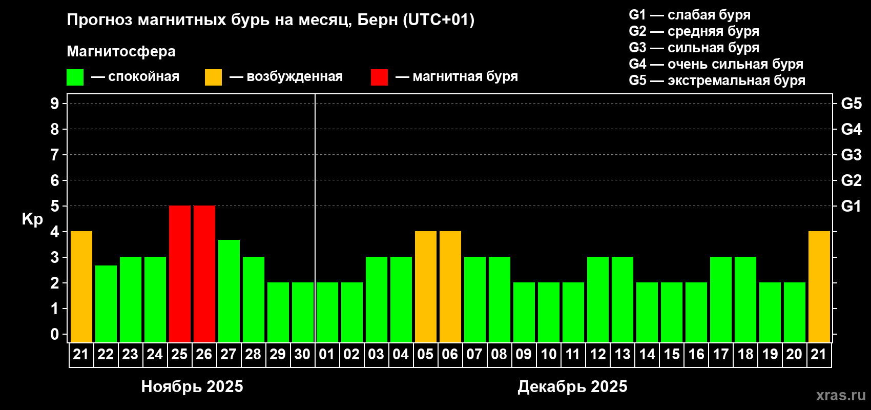 Прогноз магнитных бурь в Берне — 21 ноября 2025 года