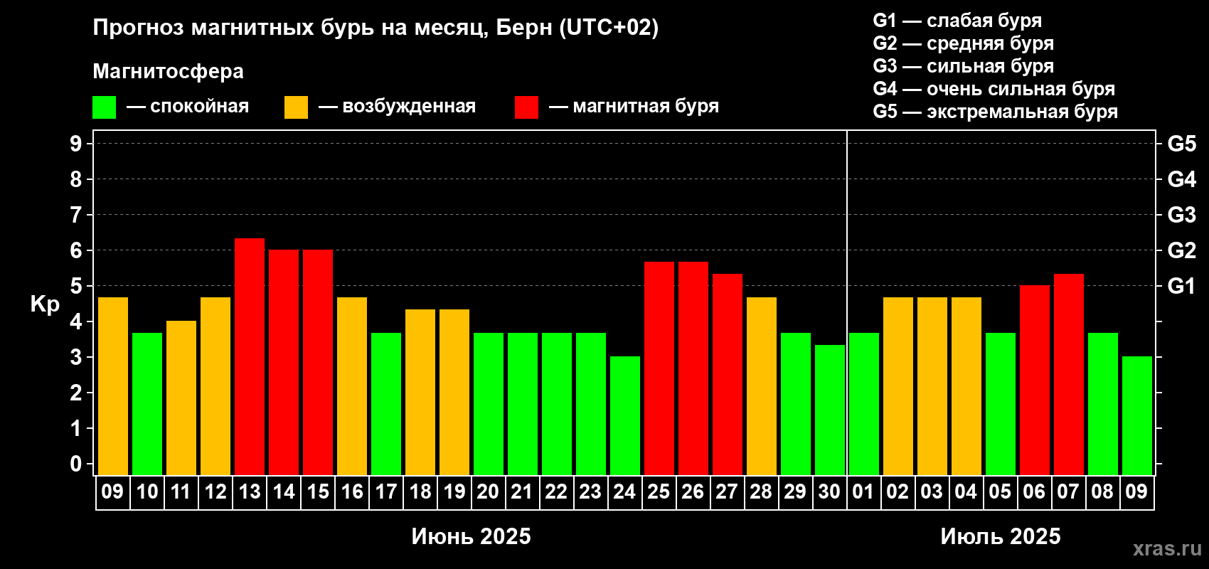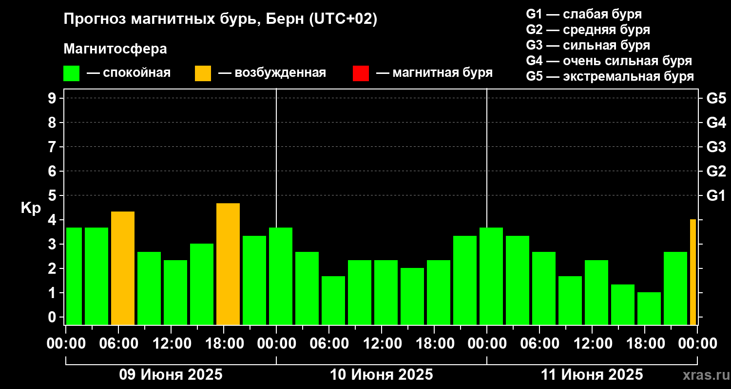 Прогноз магнитных бурь в Берне — 9 июня 2025 года