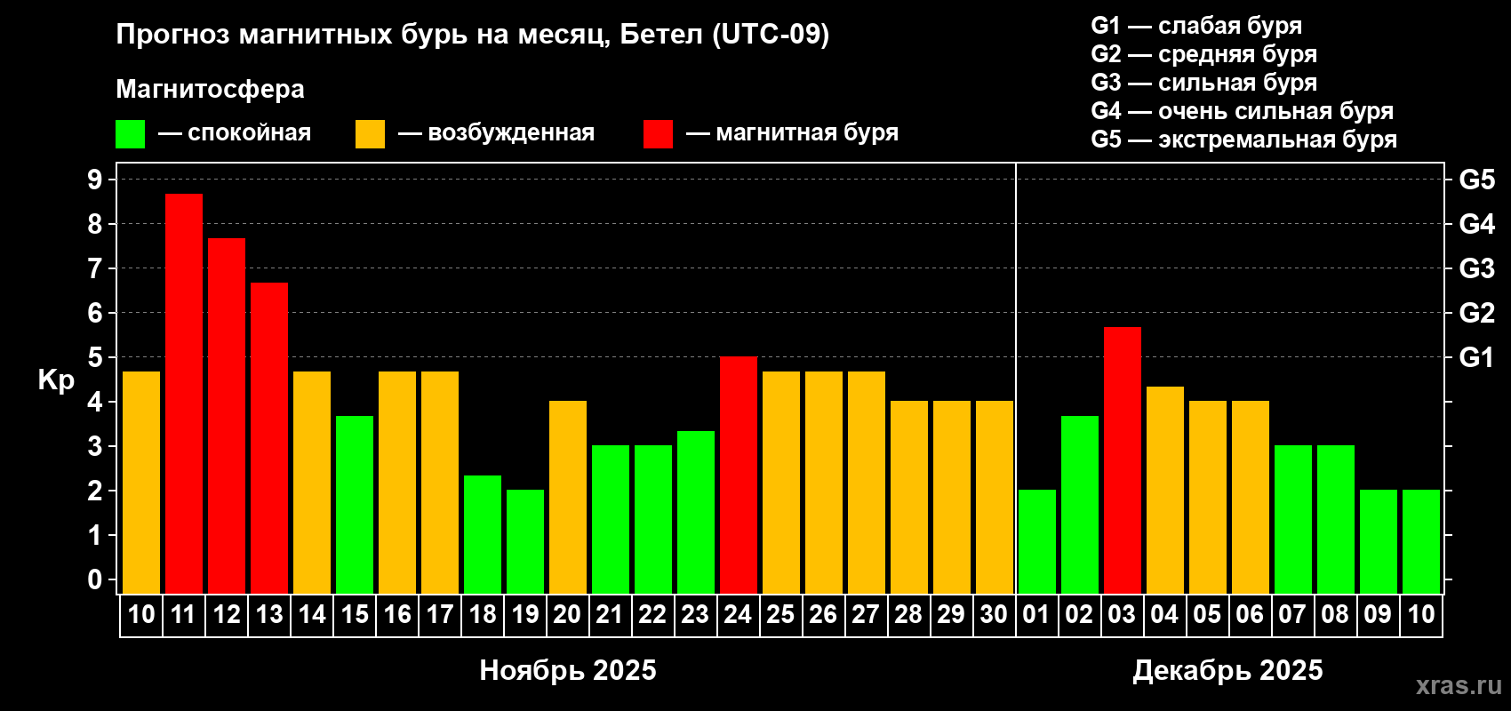 Прогноз магнитных бурь в Бетеле — 10 ноября 2025 года