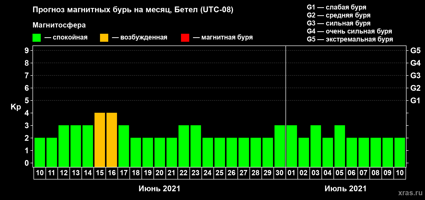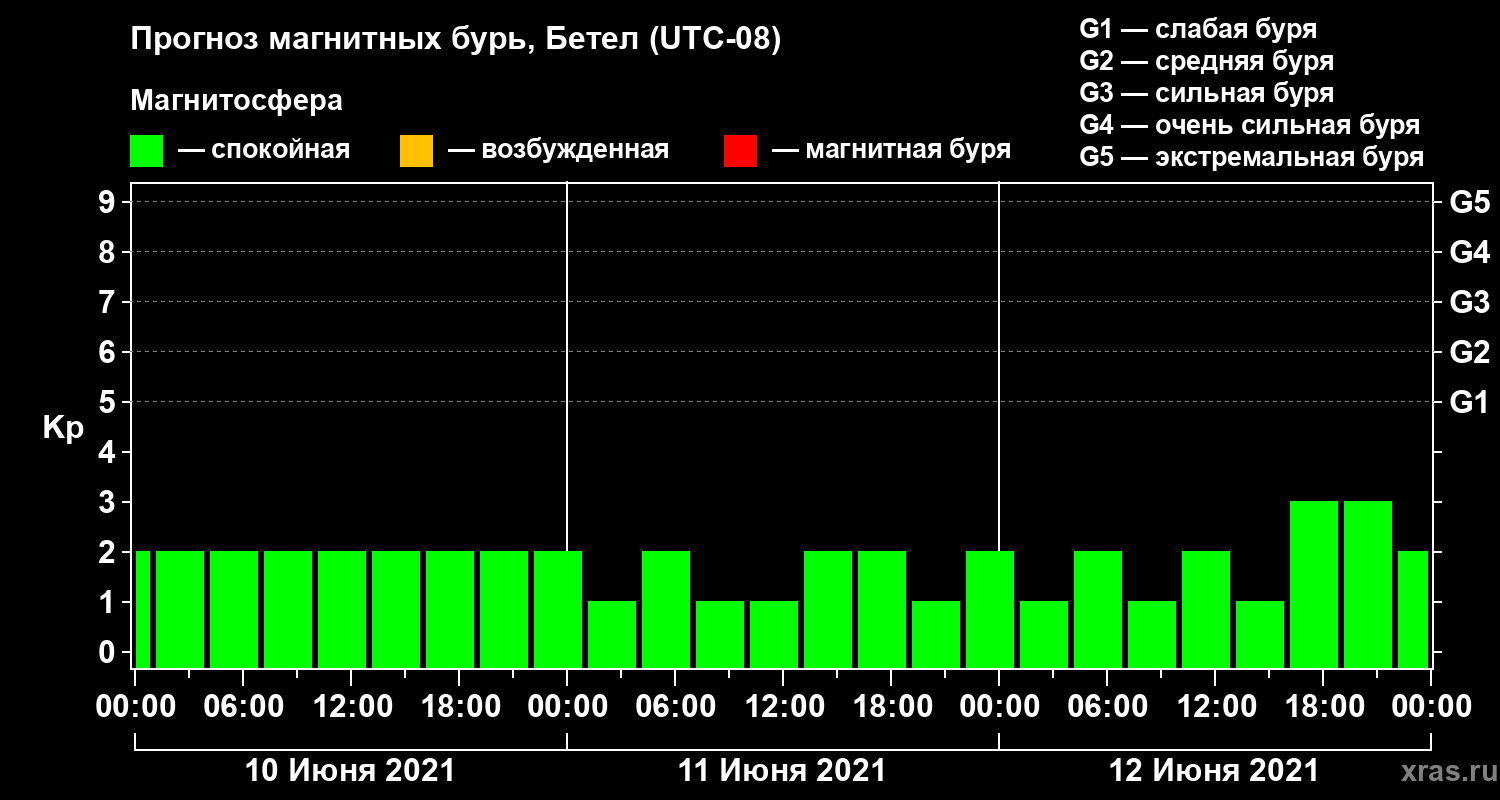 Прогноз магнитных бурь в Бетеле — 10 июня 2021 года