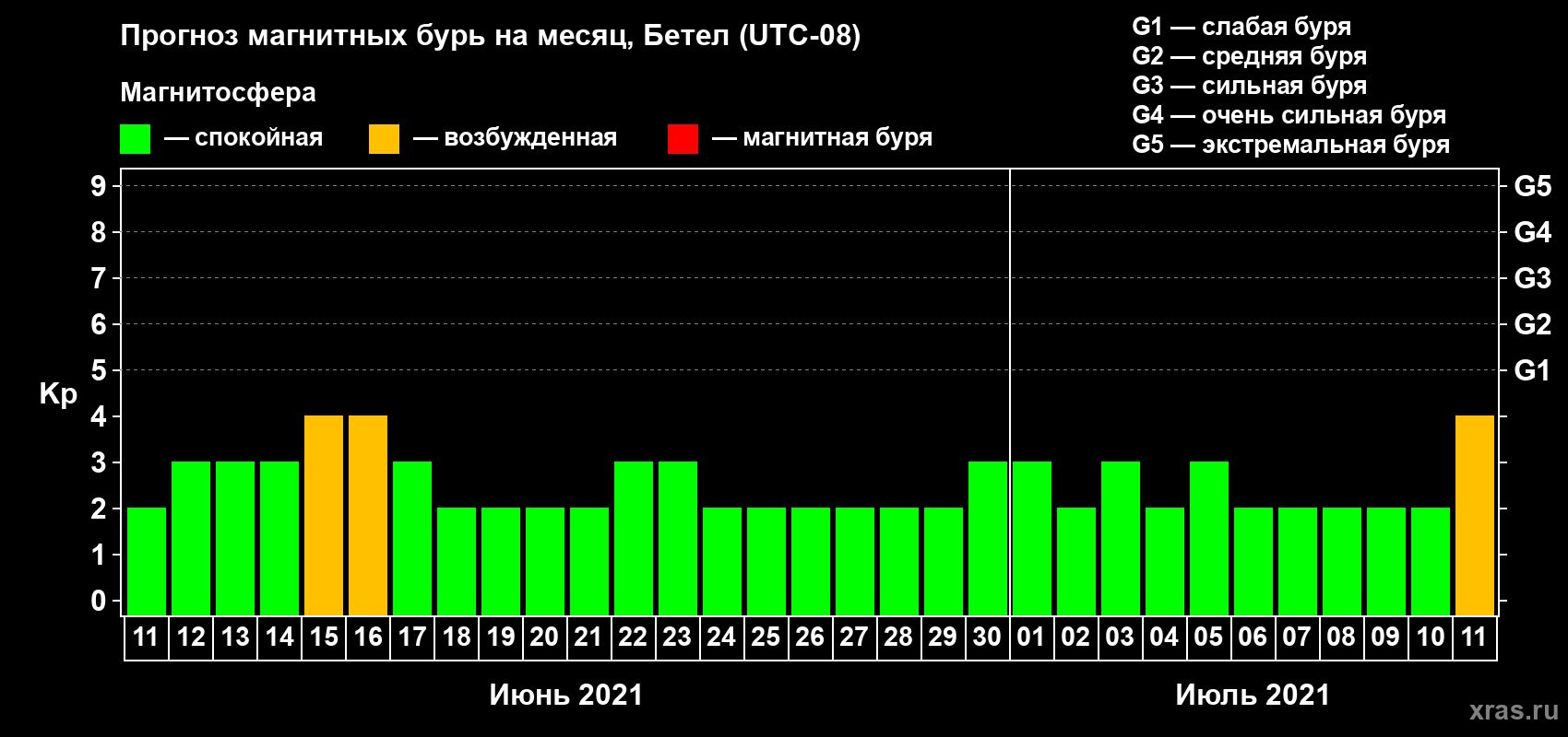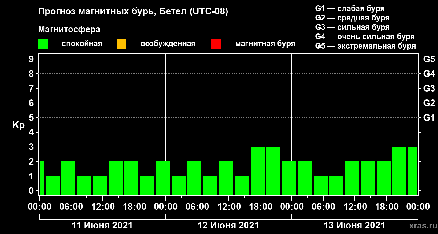 Прогноз магнитных бурь в Бетеле — 11 июня 2021 года