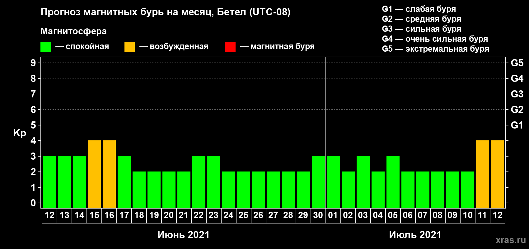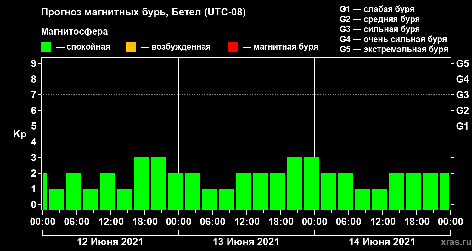 Прогноз магнитных бурь в Бетеле — 12 июня 2021 года