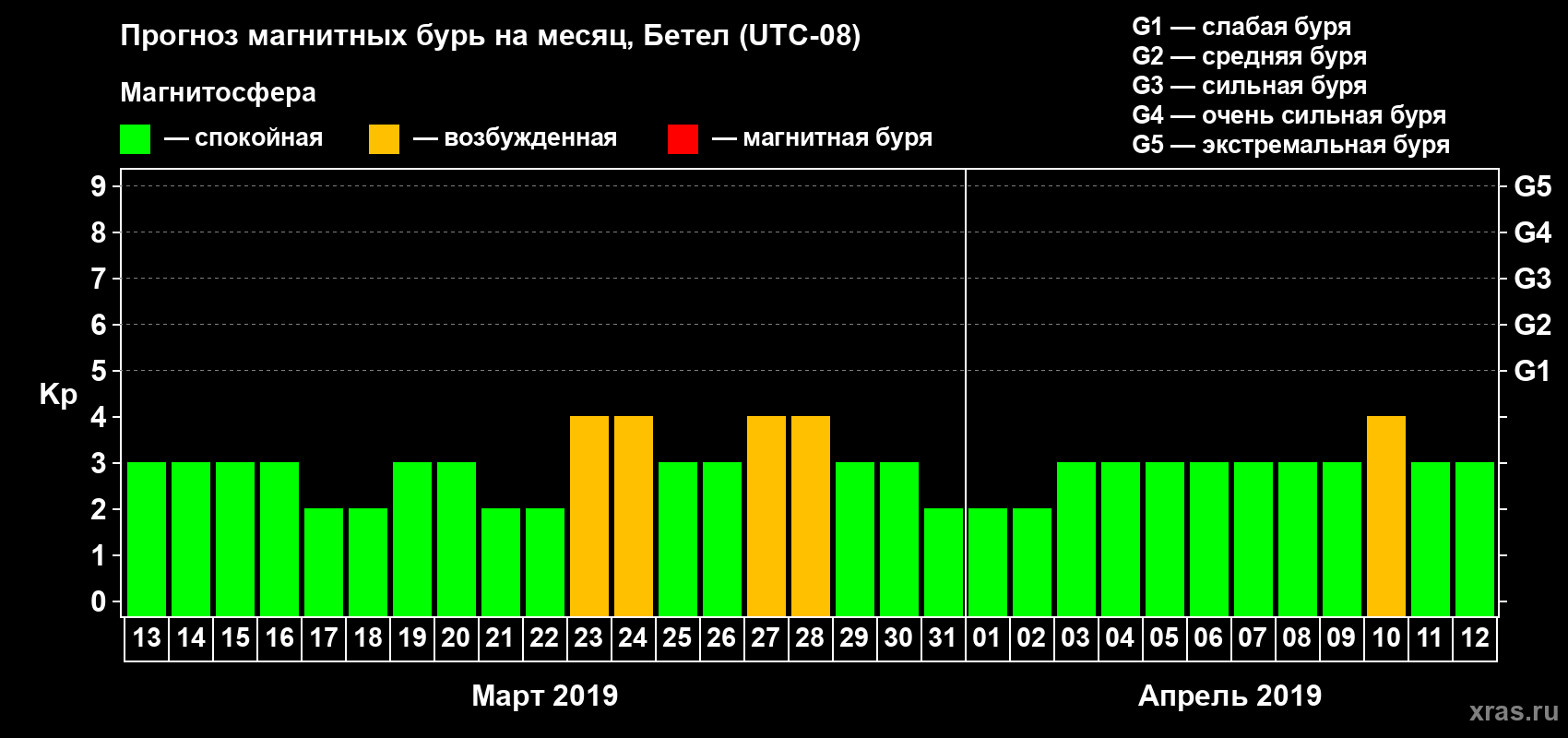 Прогноз магнитных бурь в Бетеле на 13 марта 2019 года