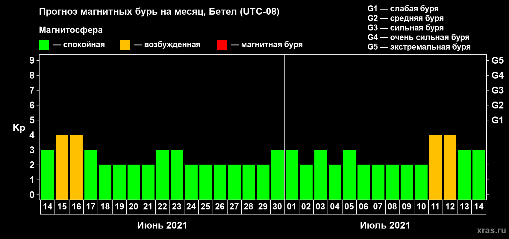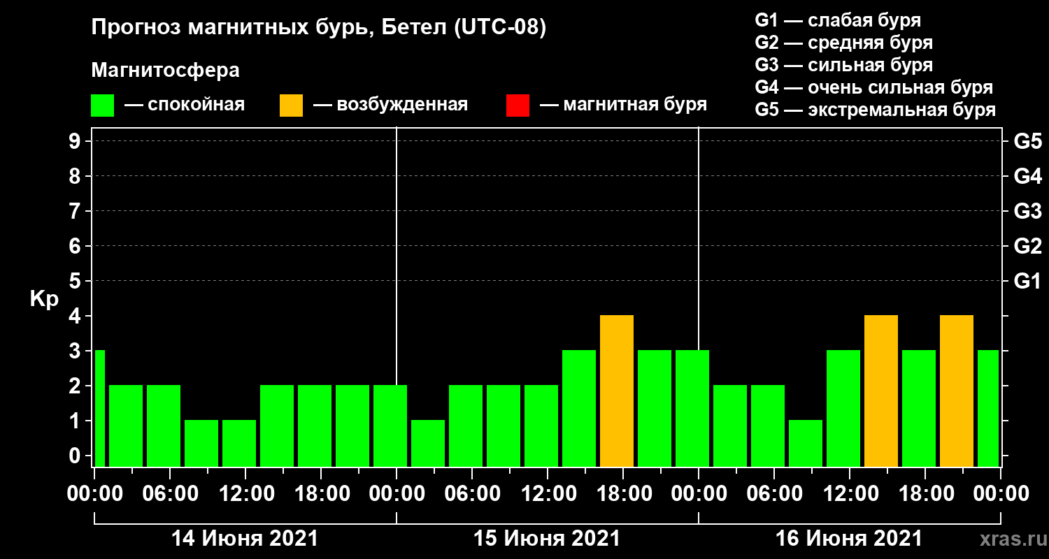 Прогноз магнитных бурь в Бетеле — 14 июня 2021 года