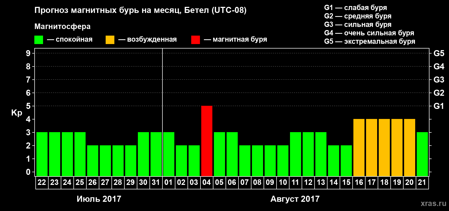 Прогноз магнитных бурь в Бетеле — 22 июля 2017 года