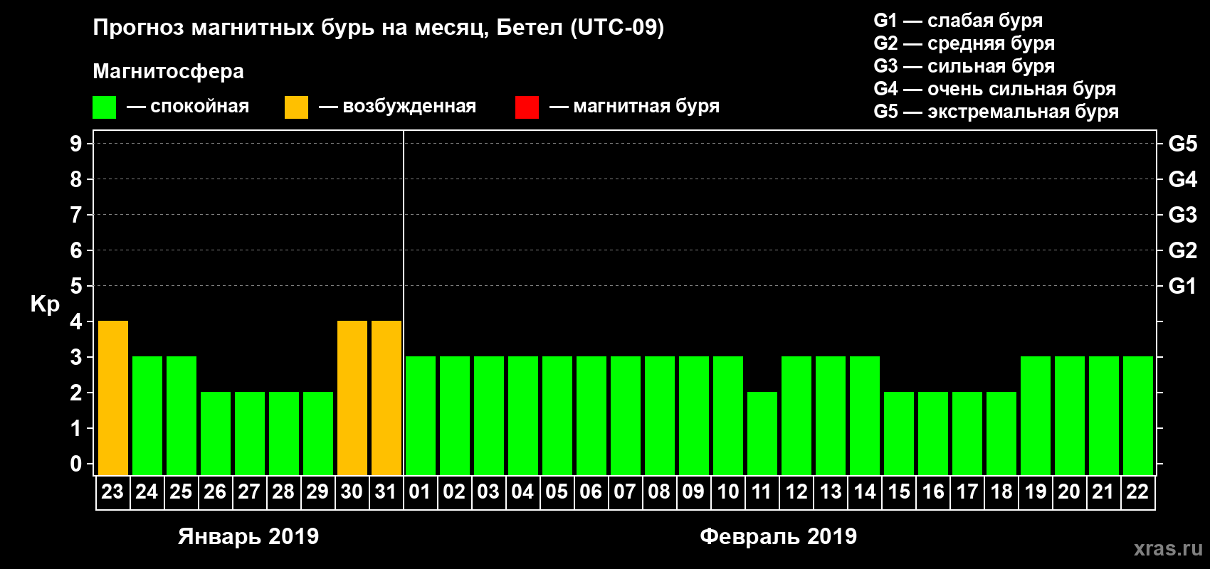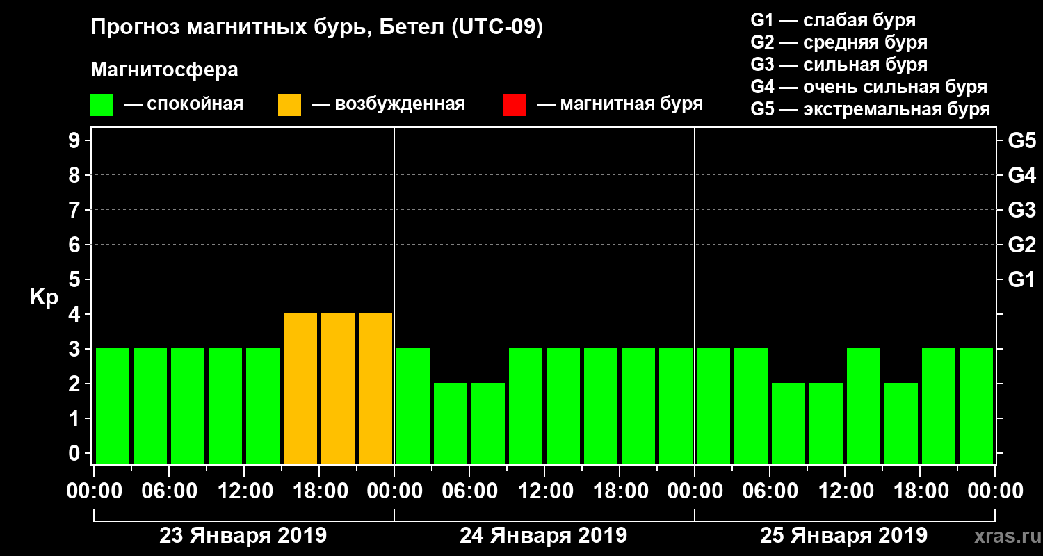 Прогноз магнитных бурь в Бетеле на 23 января 2019 года