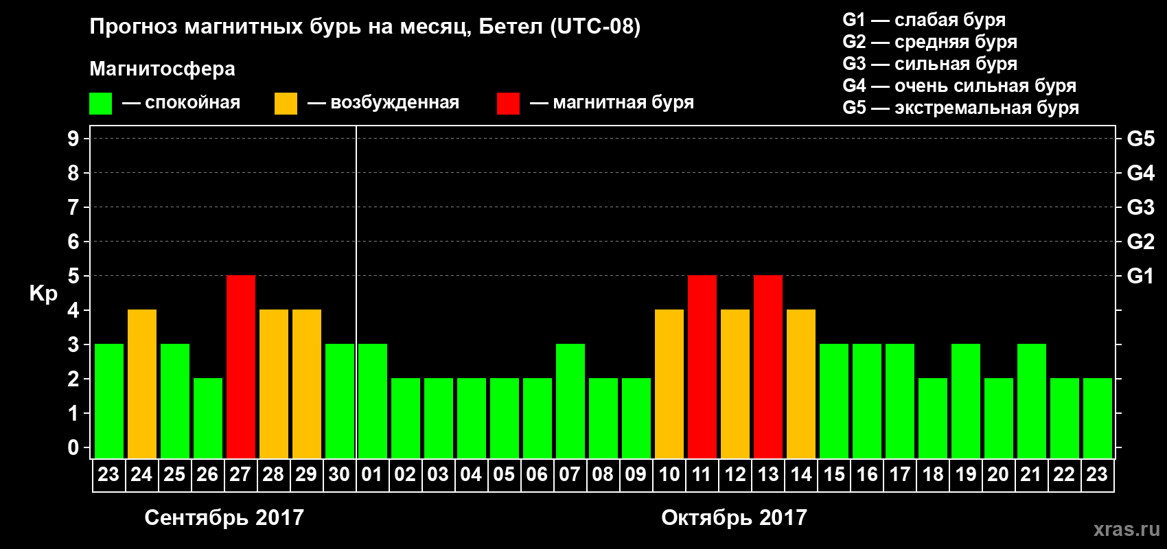 Прогноз магнитных бурь в Бетеле — 23 сентября 2017 года