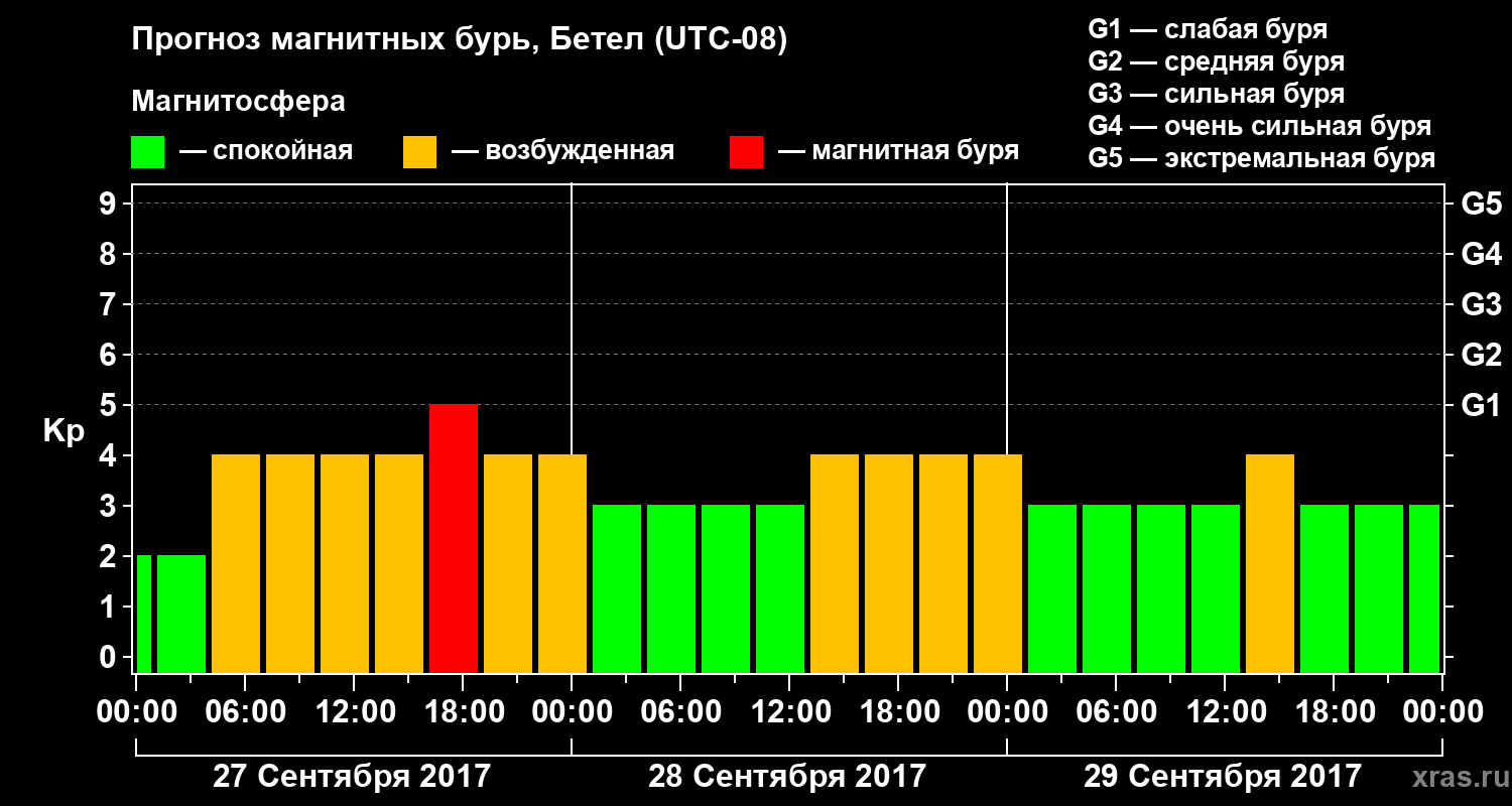 Прогноз магнитных бурь в Бетеле на 27 сентября 2017 года
