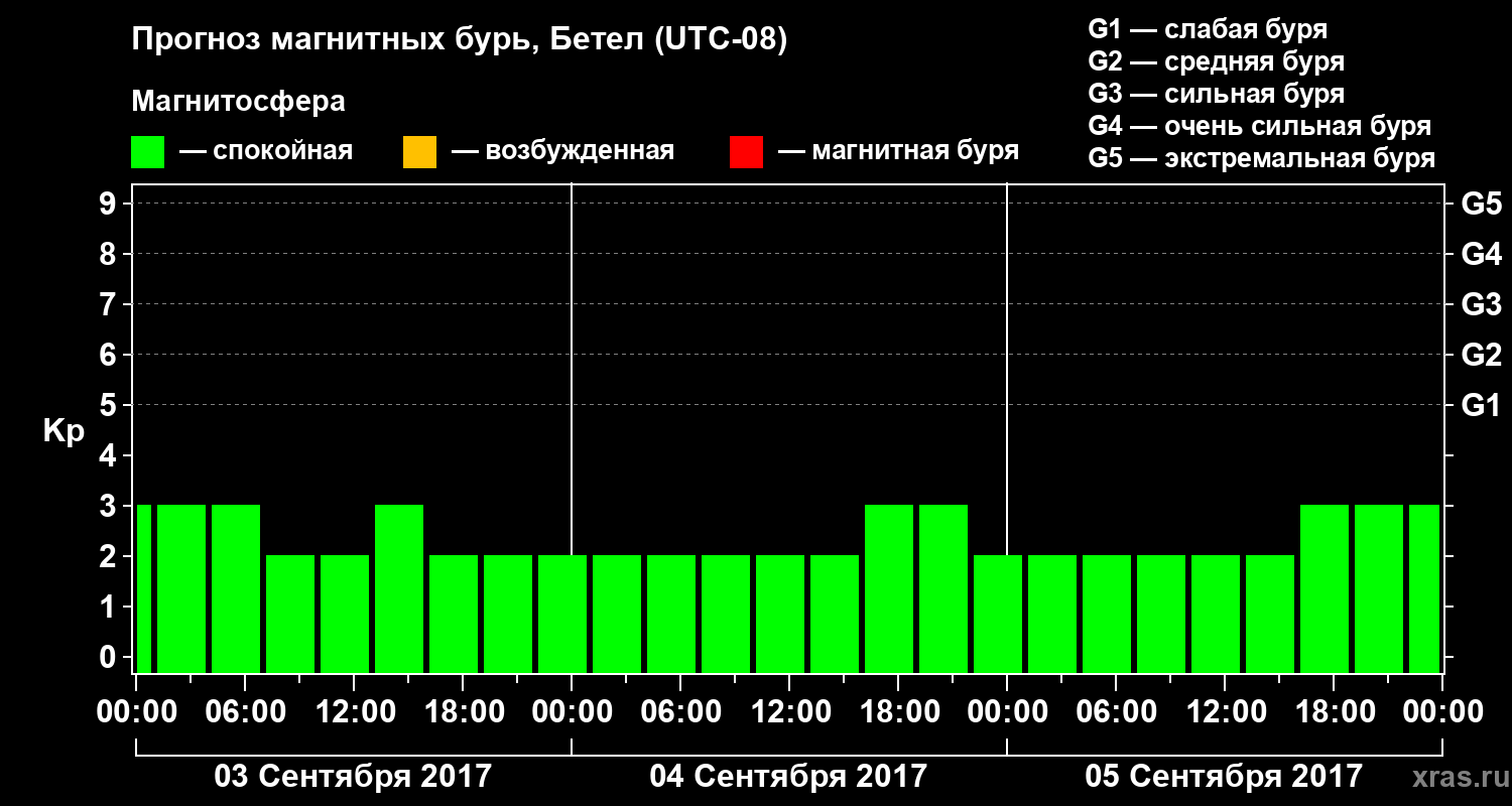 Прогноз магнитных бурь в Бетеле на 3 сентября 2017 года