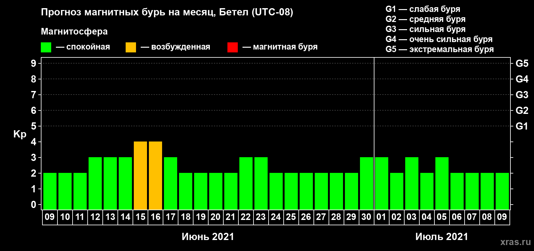 Прогноз магнитных бурь в Бетеле — 9 июня 2021 года