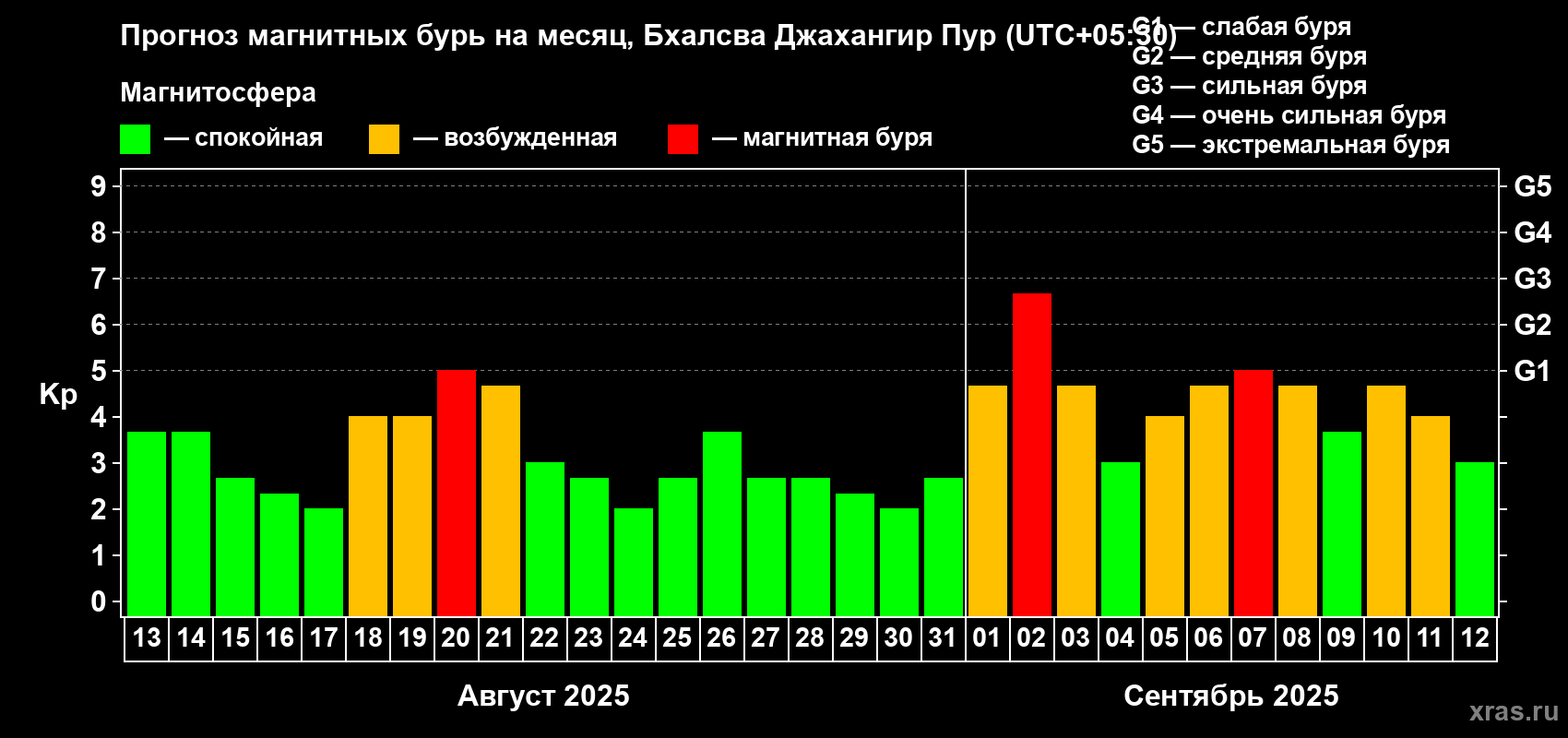 Прогноз магнитных бурь в Бхалсва Джахангир Пуре на 13 августа 2025 года