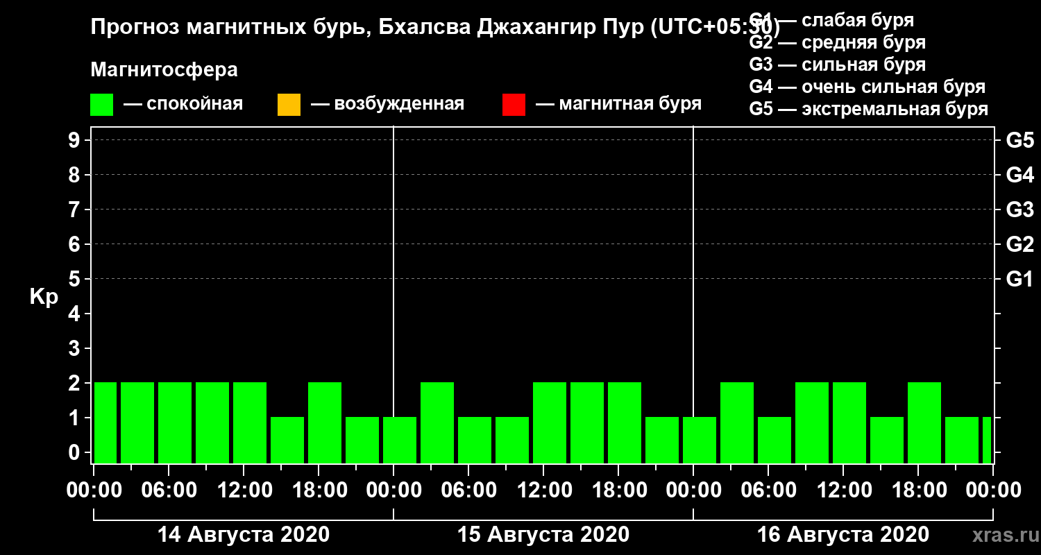 Прогноз магнитных бурь в Бхалсва Джахангир Пуре на 14 августа 2020 года