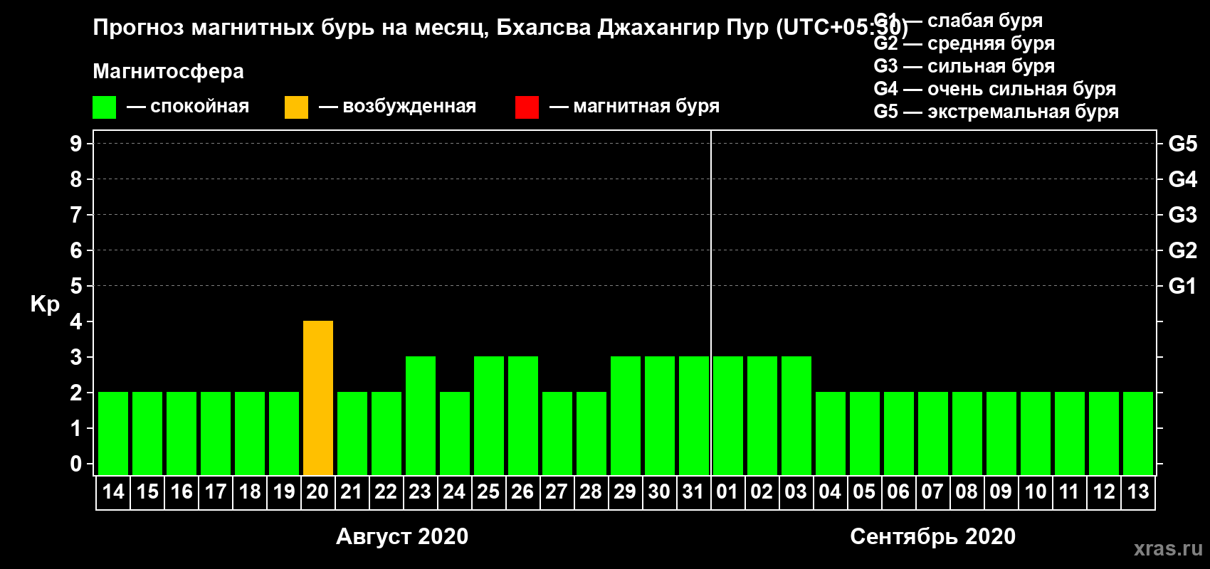 Прогноз магнитных бурь в Бхалсва Джахангир Пуре — 14 августа 2020 года