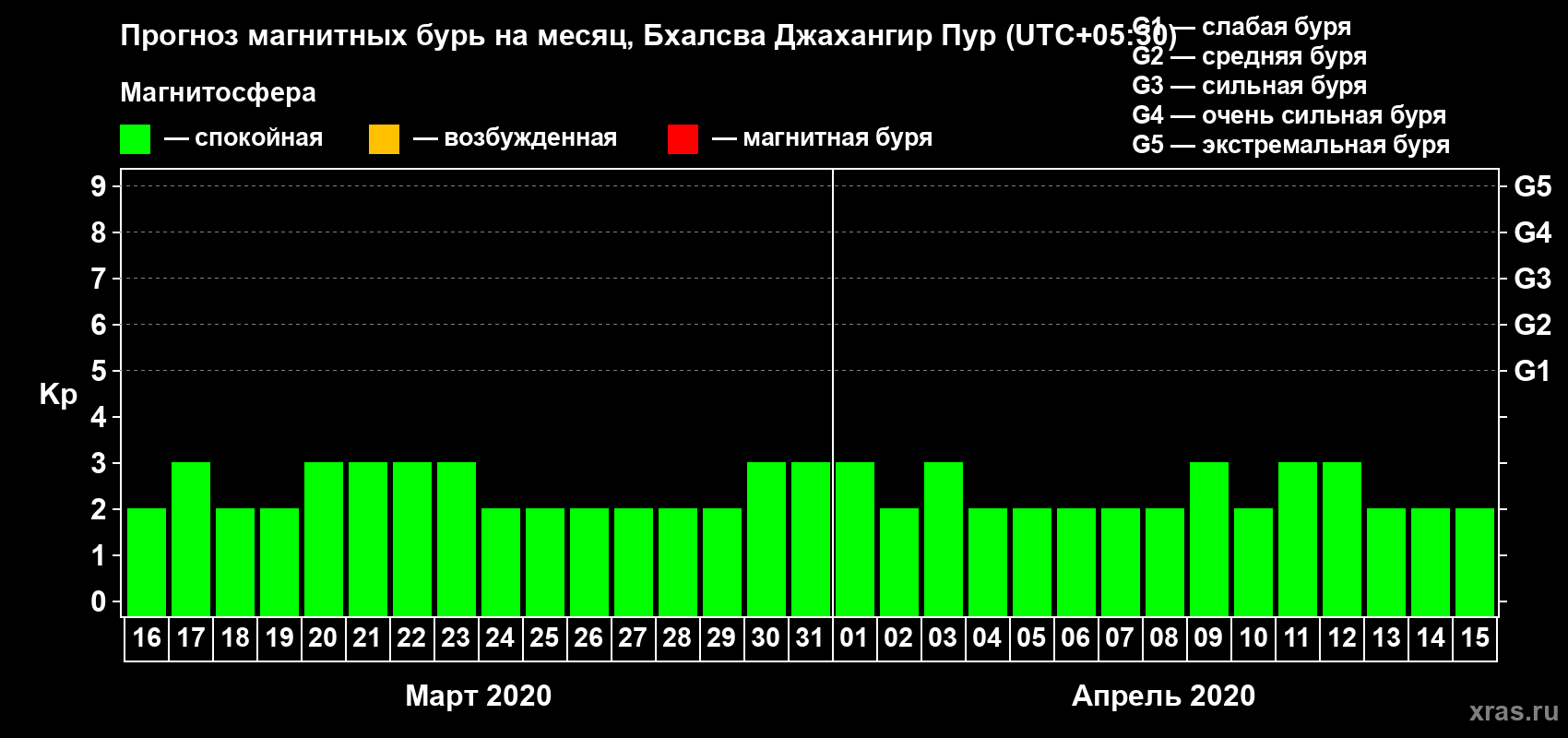 Прогноз максимального суточного геомагнитного индекса Kp на 1 месяц (31 день) с 16 марта по 15 апреля 2020 г