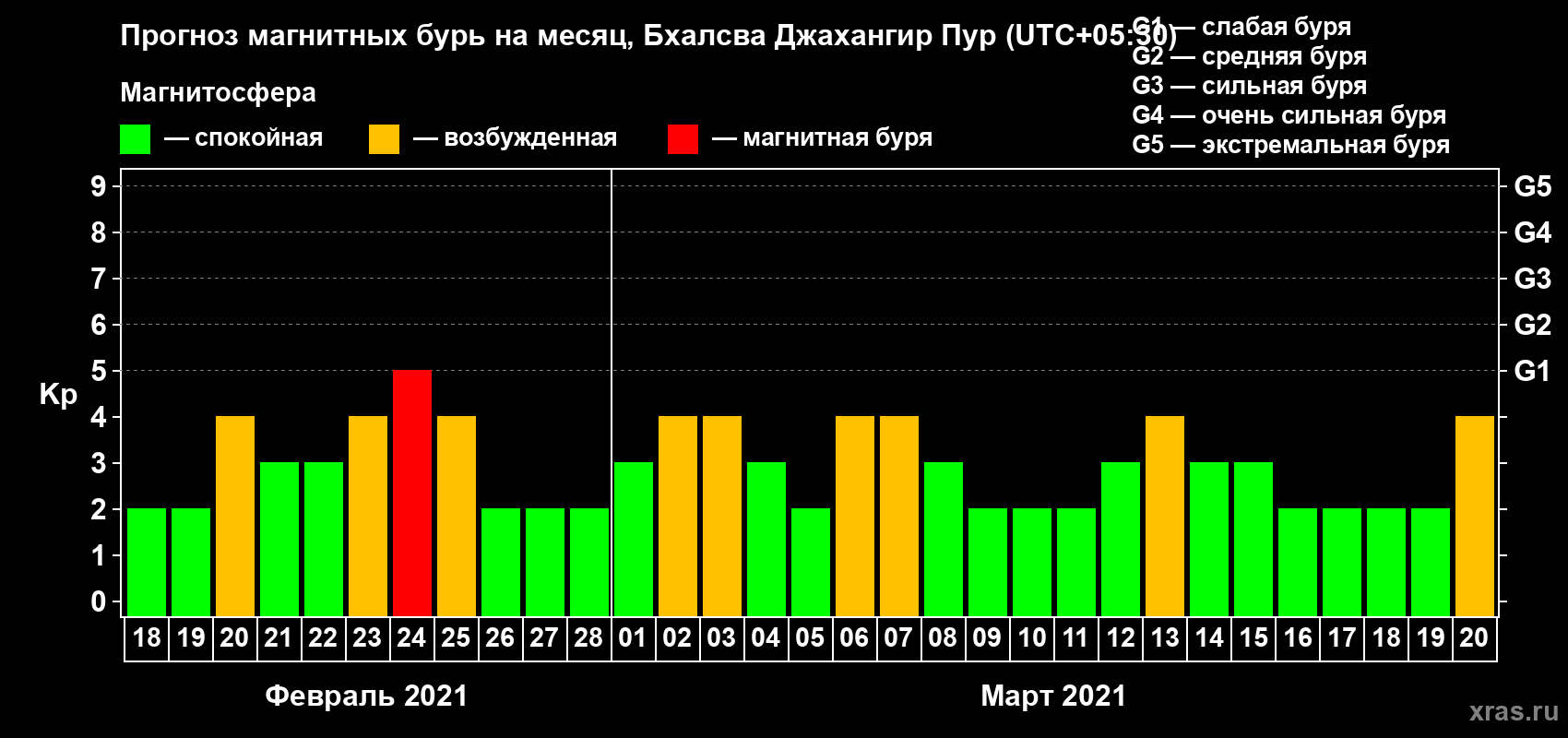 Прогноз максимального суточного геомагнитного индекса Kp на 1 месяц (31 день) с 18 февраля по 20 марта 2021 г
