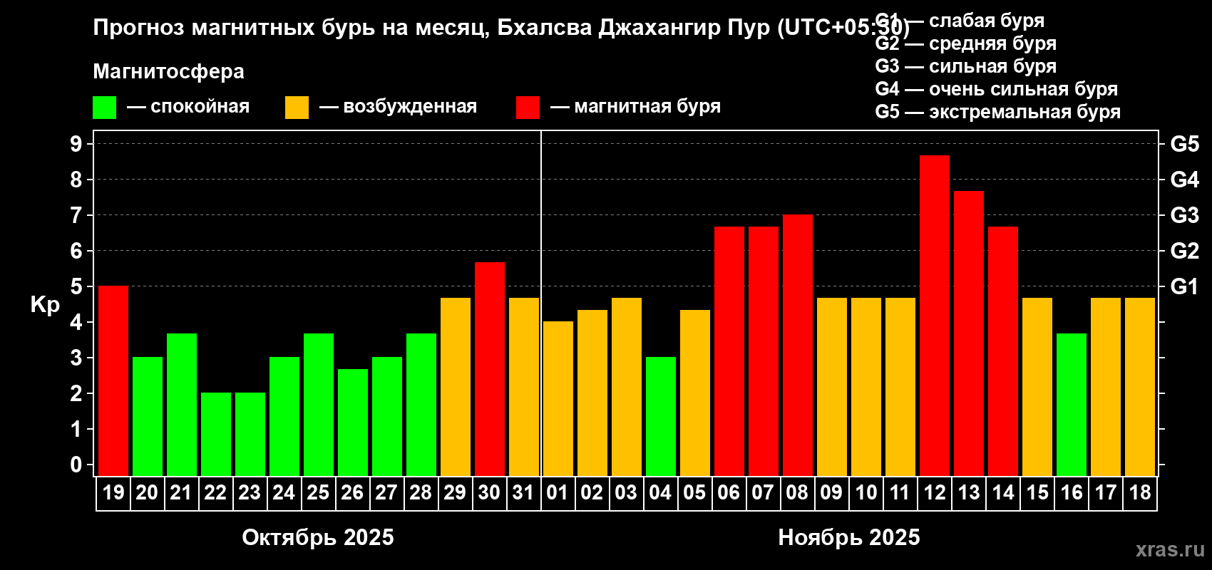 Прогноз максимального суточного геомагнитного индекса Kp на 1 месяц (31 день) с 19 октября по 18 ноября 2025 г