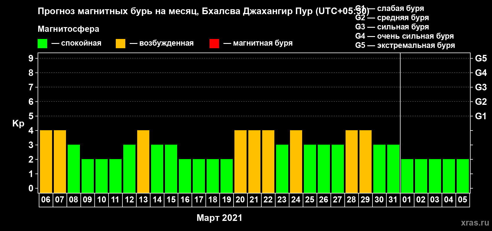 Прогноз максимального суточного геомагнитного индекса Kp на 1 месяц (31 день) с 06 марта по 05 апреля 2021 г