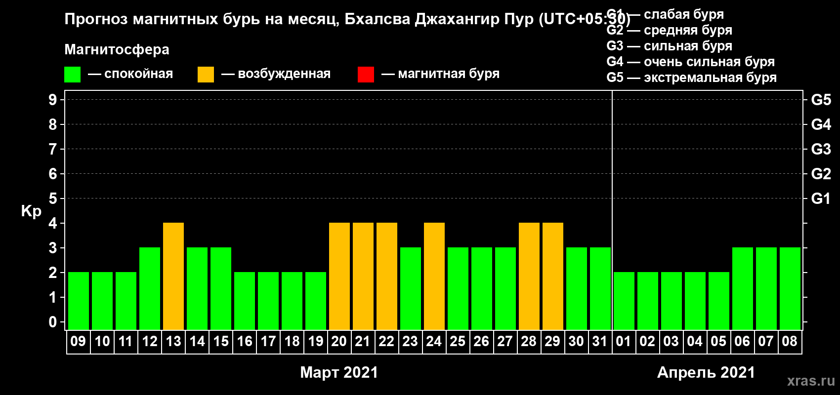 Прогноз максимального суточного геомагнитного индекса Kp на 1 месяц (31 день) с 09 марта по 08 апреля 2021 г