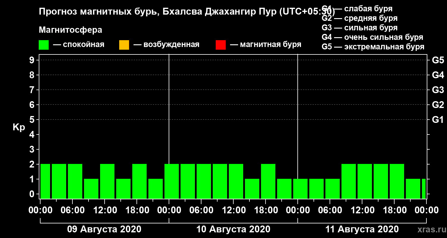 Прогноз магнитных бурь в Бхалсва Джахангир Пуре — 9 августа 2020 года