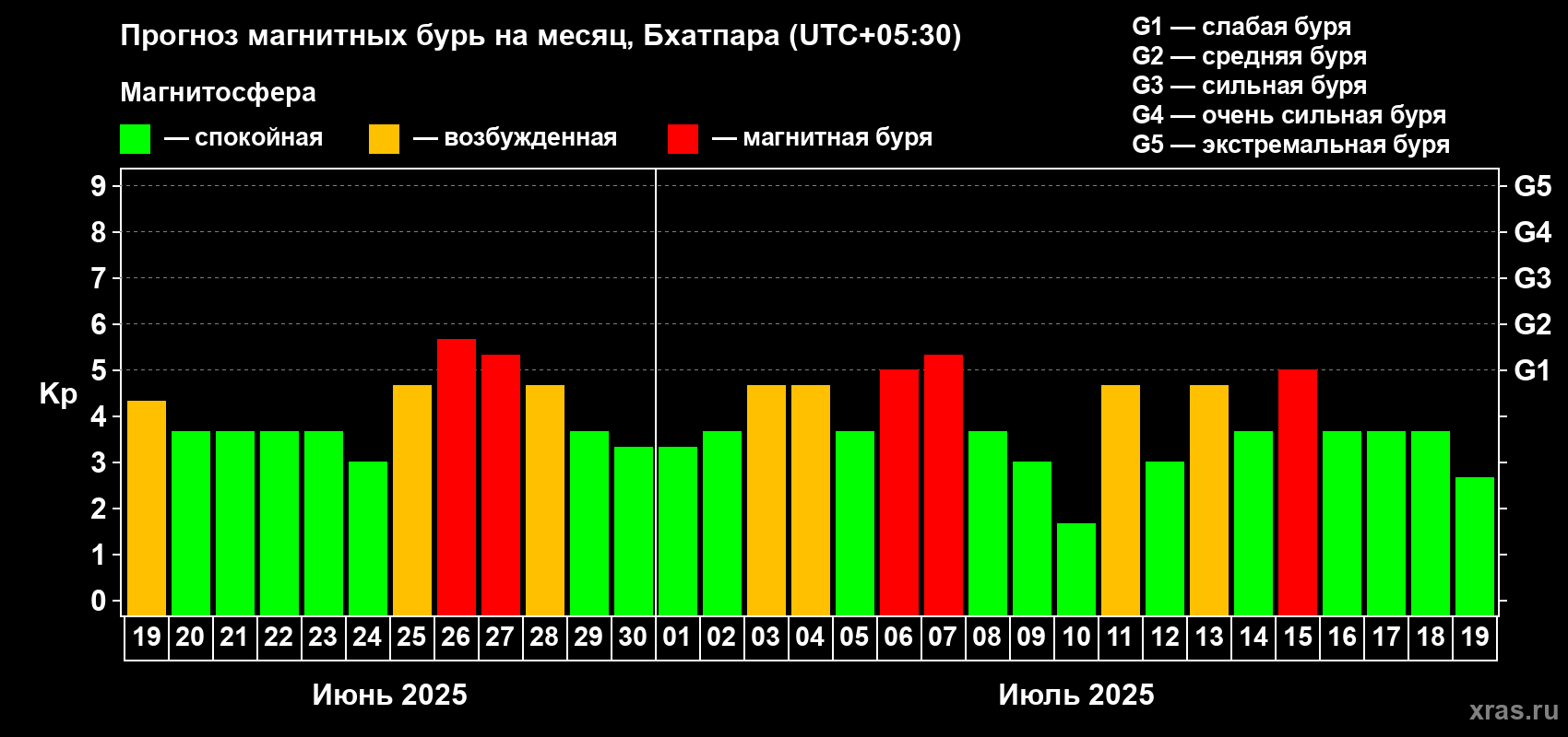 Прогноз магнитных бурь в Бхатпаре — 19 июня 2025 года