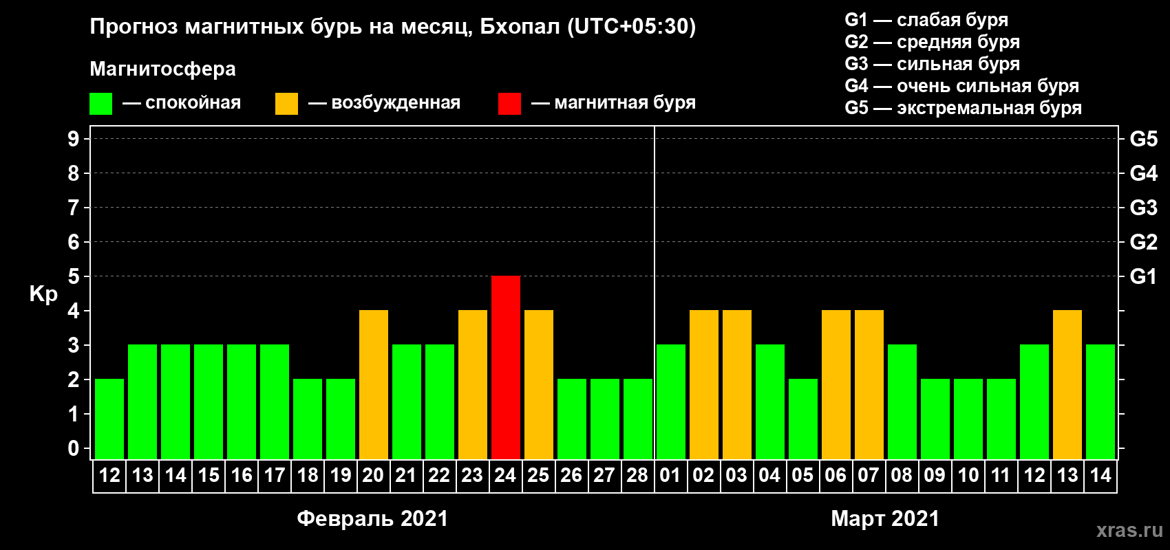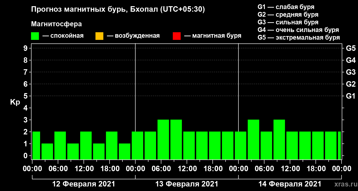 Прогноз магнитных бурь в Бхопале — 12 февраля 2021 года