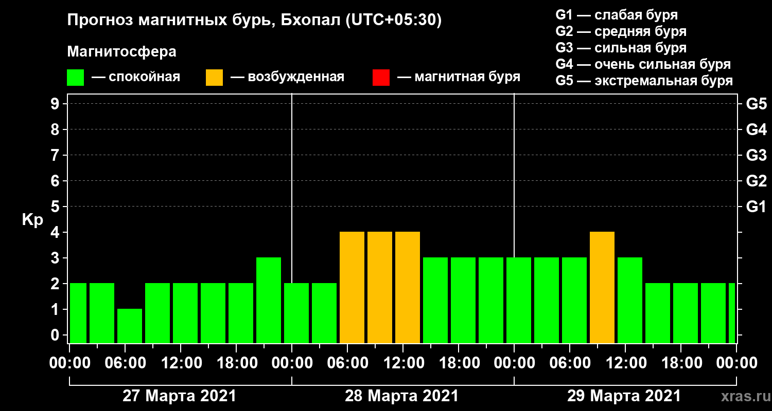 Прогноз магнитных бурь в Бхопале — 27 марта 2021 года