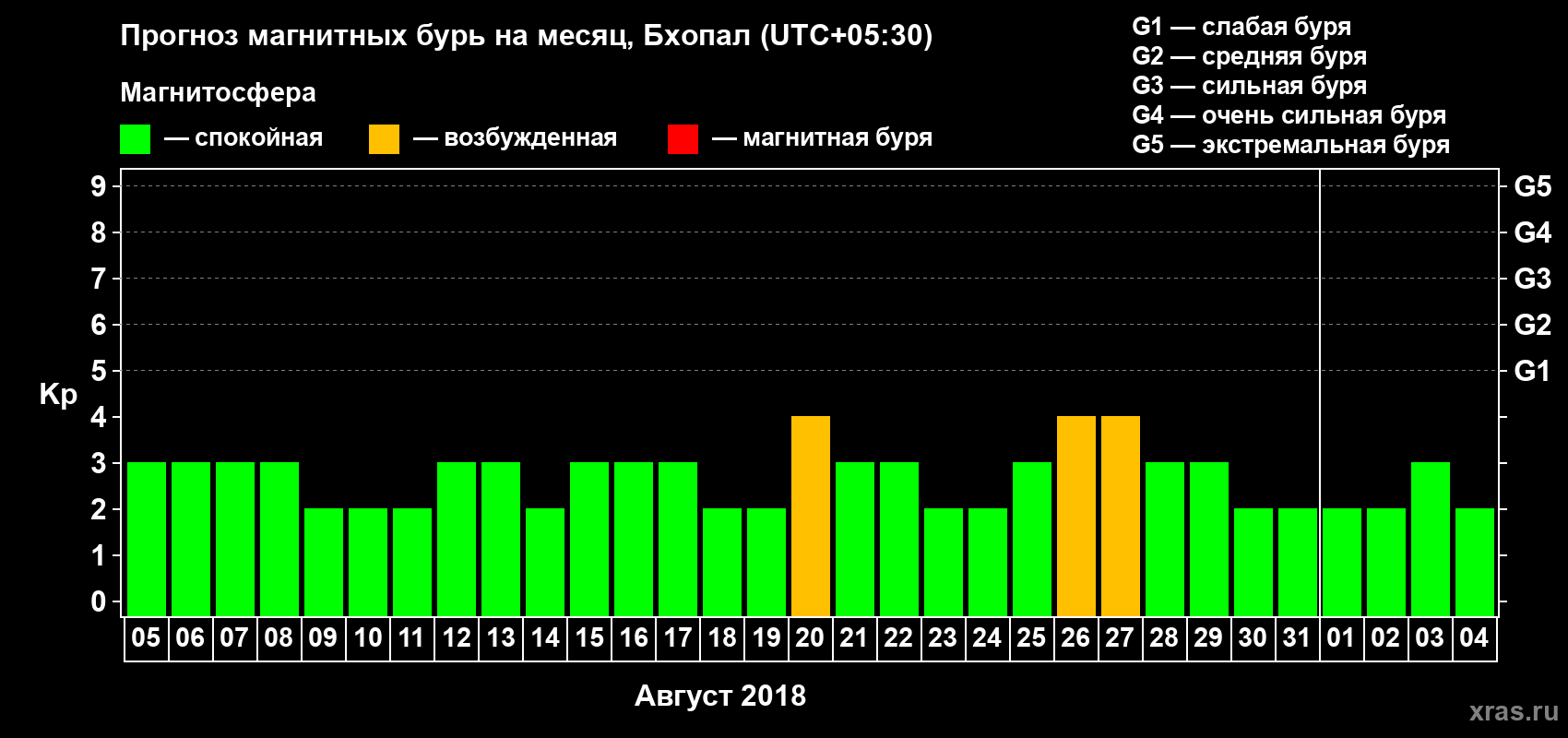 Прогноз магнитных бурь в Бхопале — 5 августа 2018 года