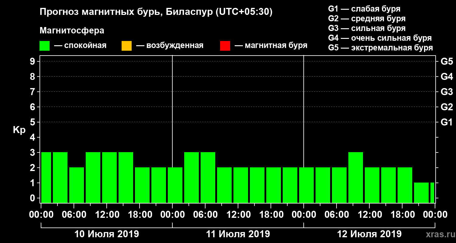 Прогноз магнитных бурь в Биласпуре — 10 июля 2019 года