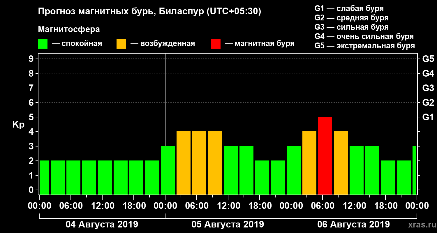 Прогноз магнитных бурь в Биласпуре — 4 августа 2019 года