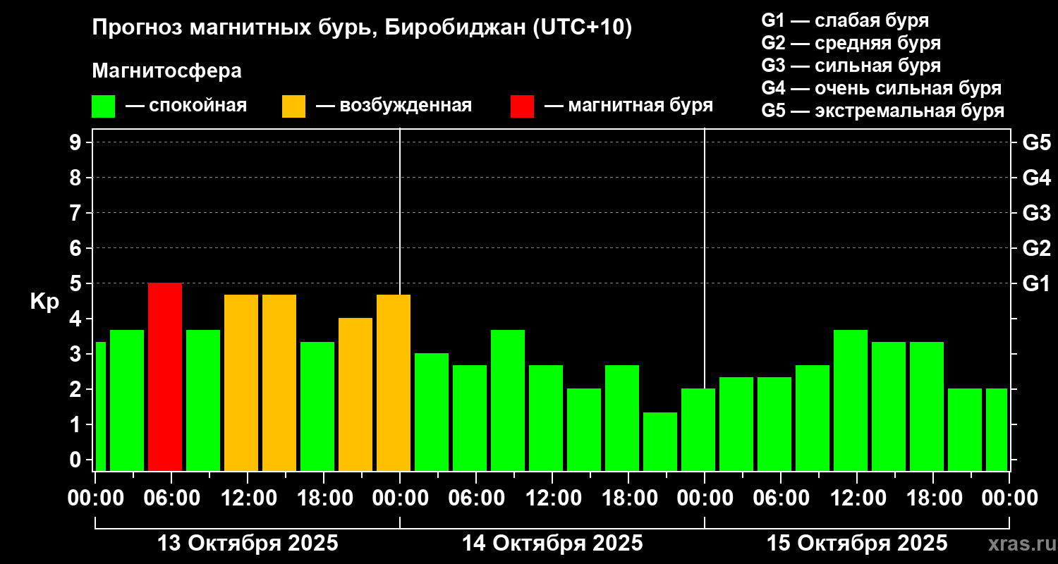 Прогноз магнитных бурь в Биробиджане — 13 октября 2025 года