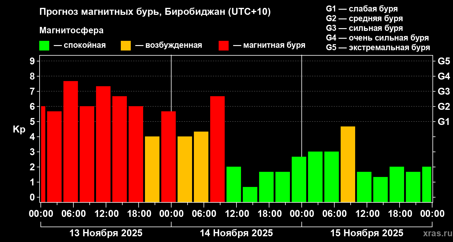 Прогноз магнитных бурь в Биробиджане на 13 ноября 2025 года