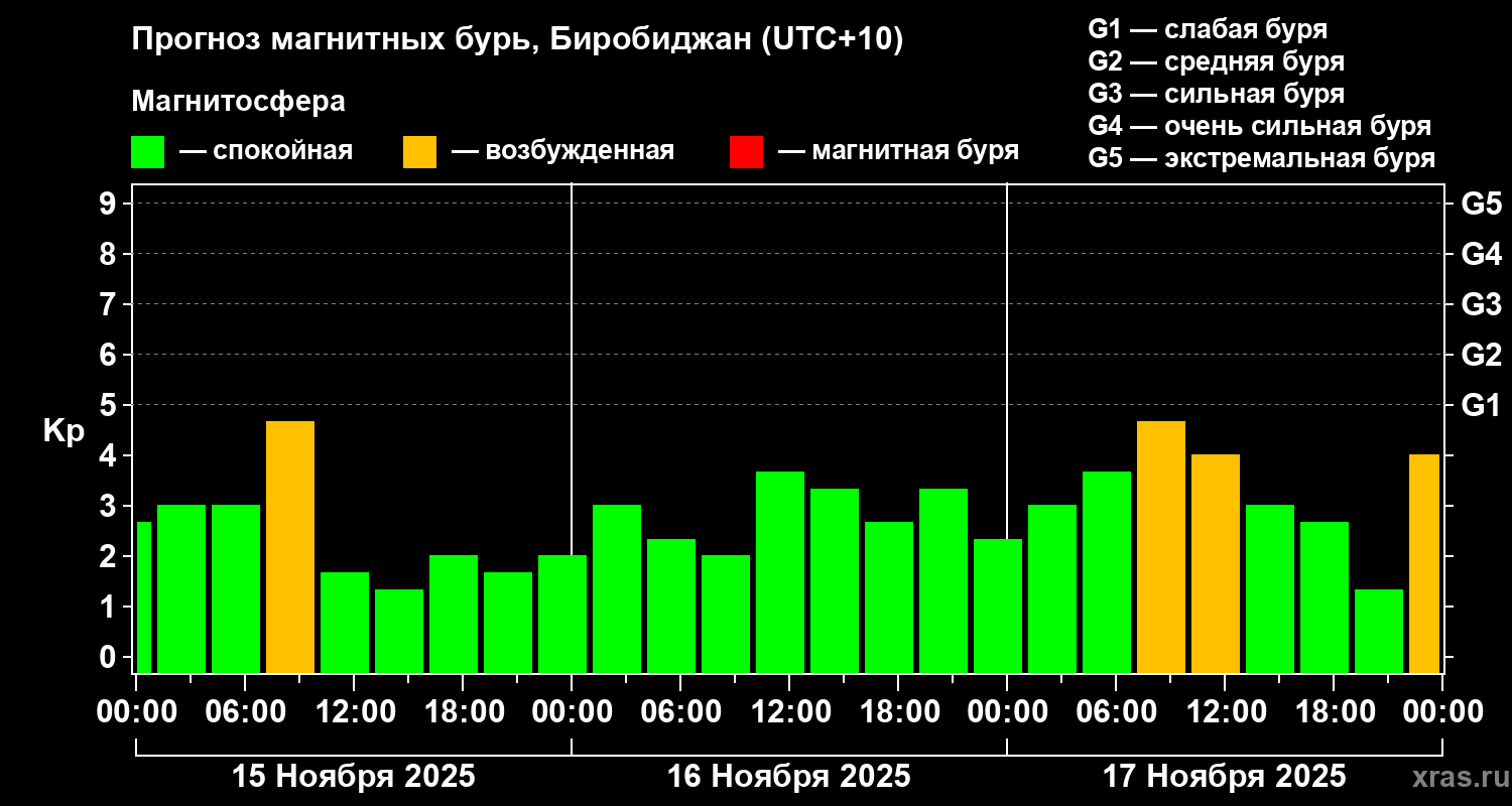 Прогноз магнитных бурь в Биробиджане — 15 ноября 2025 года