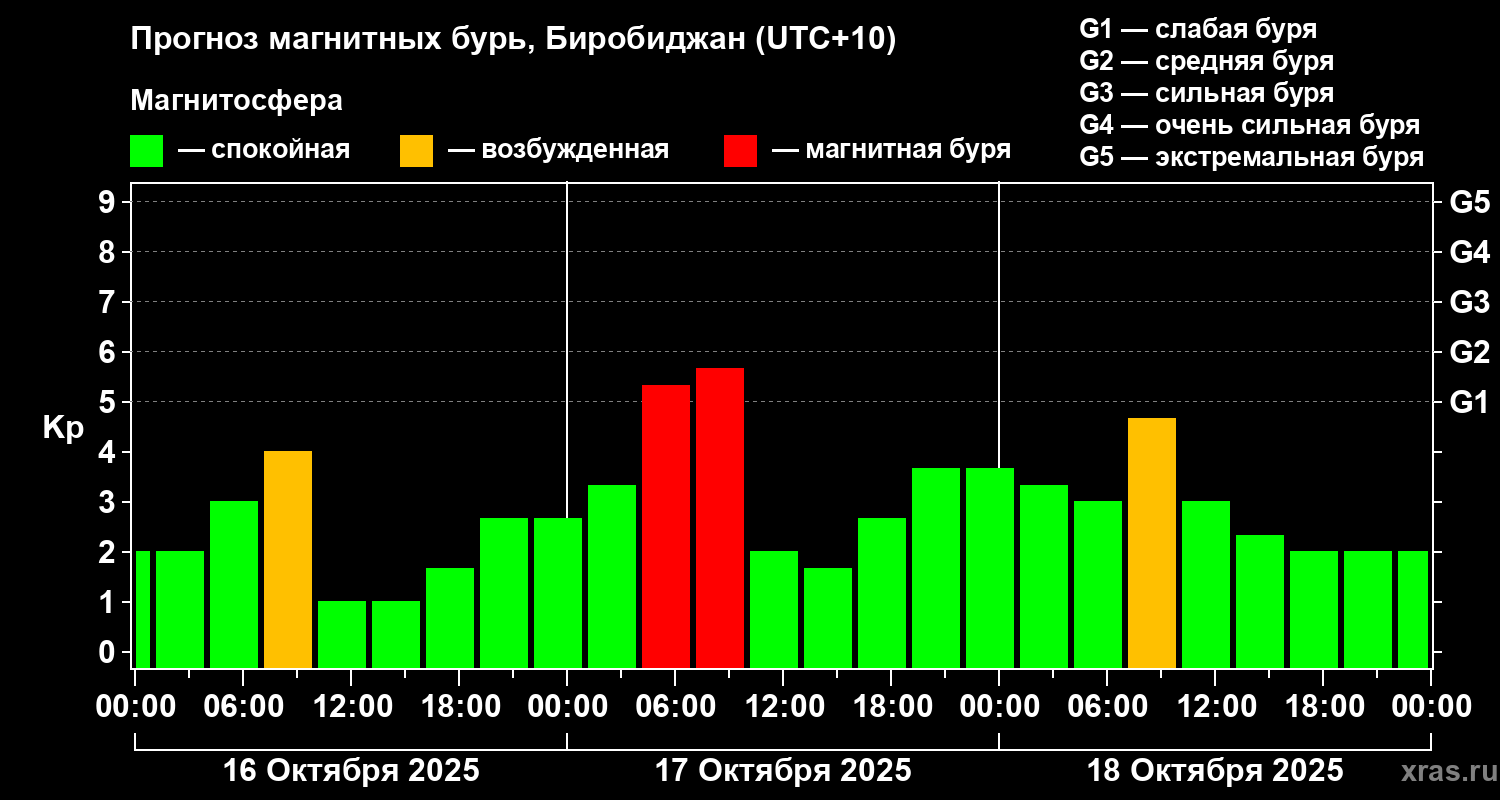 Прогноз магнитных бурь в Биробиджане — 16 октября 2025 года