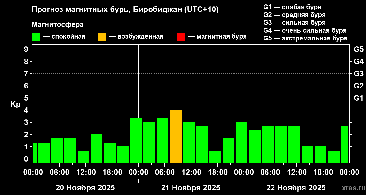 Прогноз магнитных бурь в Биробиджане — 20 ноября 2025 года