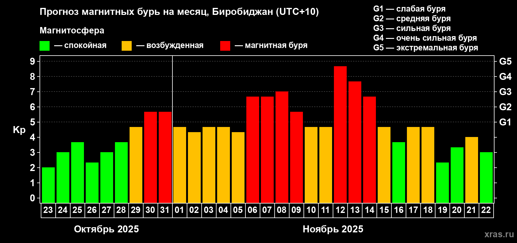 Прогноз магнитных бурь в Биробиджане на 23 октября 2025 года