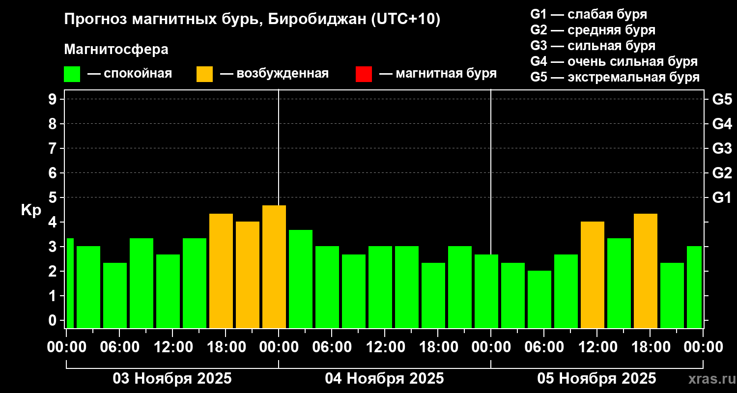 Прогноз магнитных бурь в Биробиджане — 3 ноября 2025 года