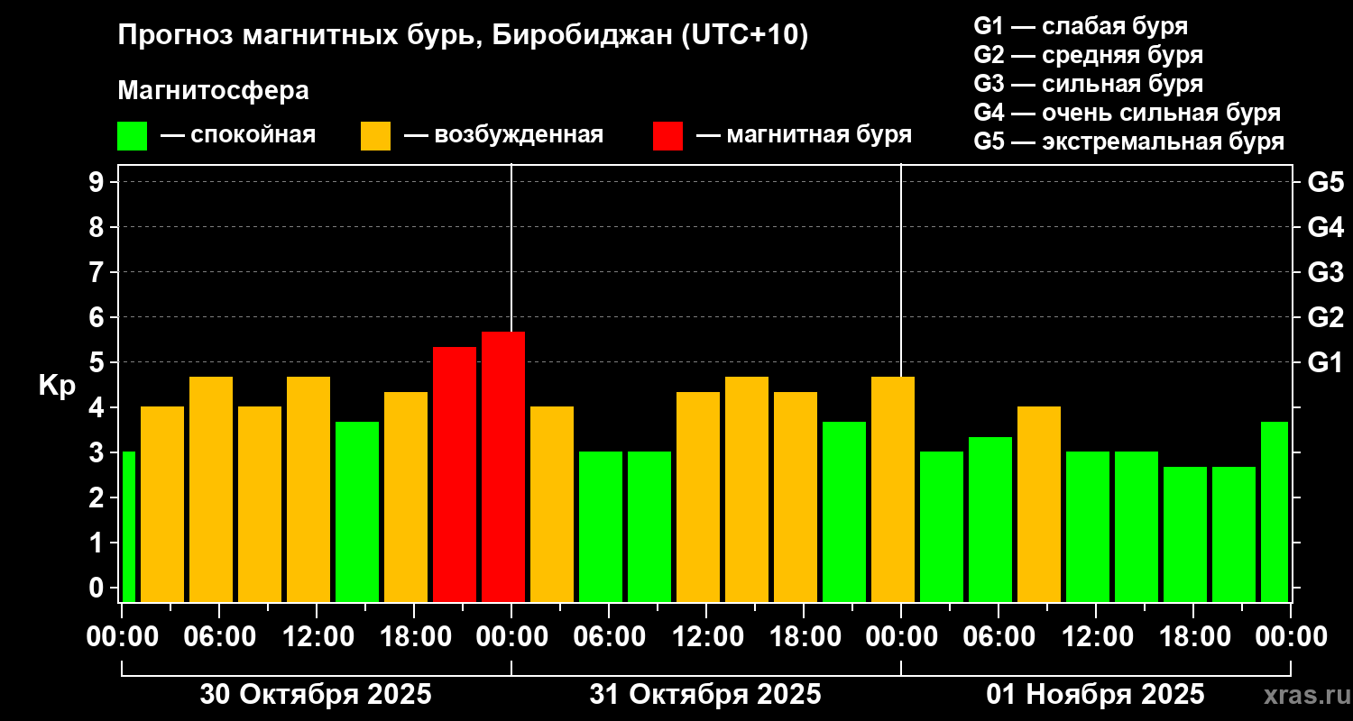 Прогноз магнитных бурь в Биробиджане — 30 октября 2025 года