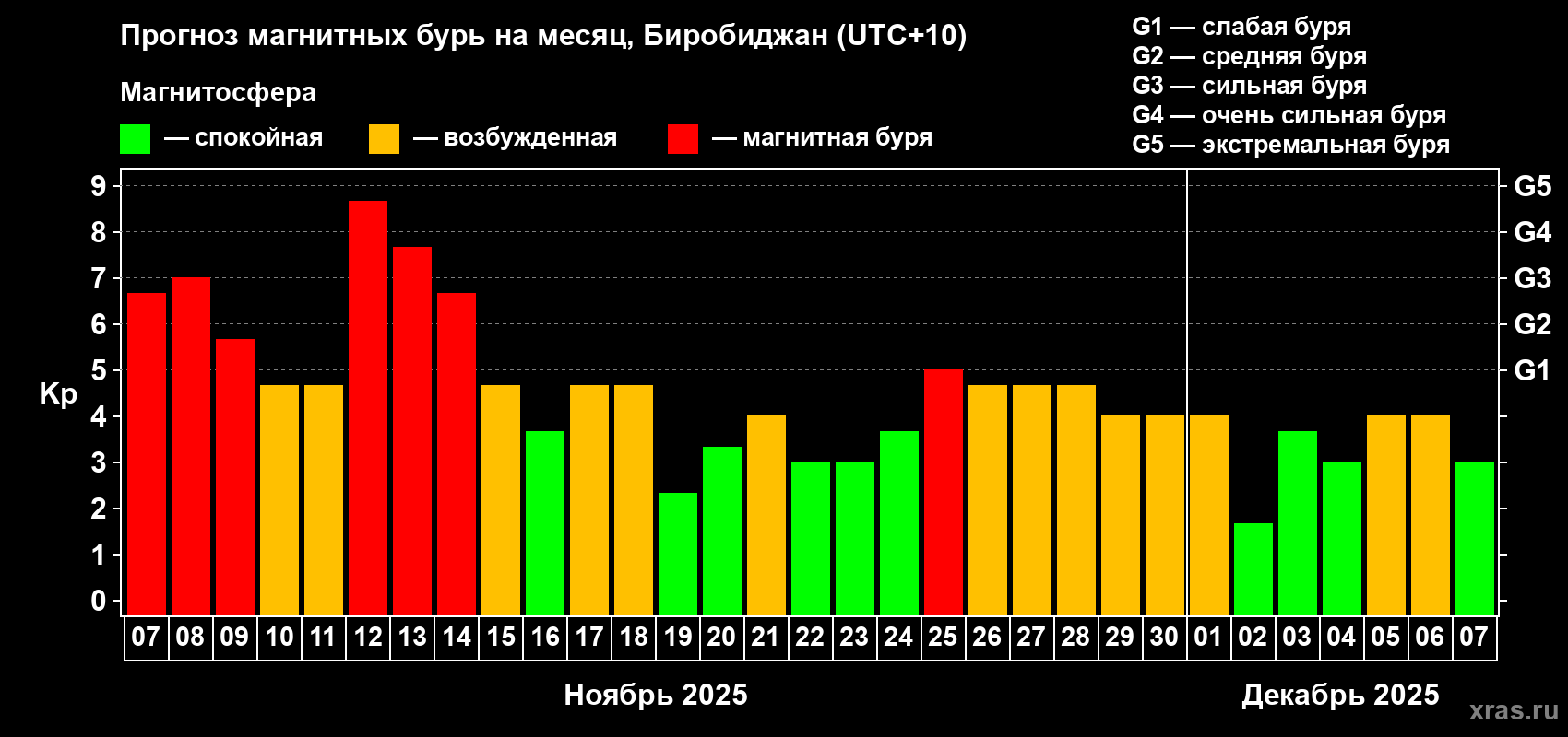 Прогноз магнитных бурь в Биробиджане — 7 ноября 2025 года