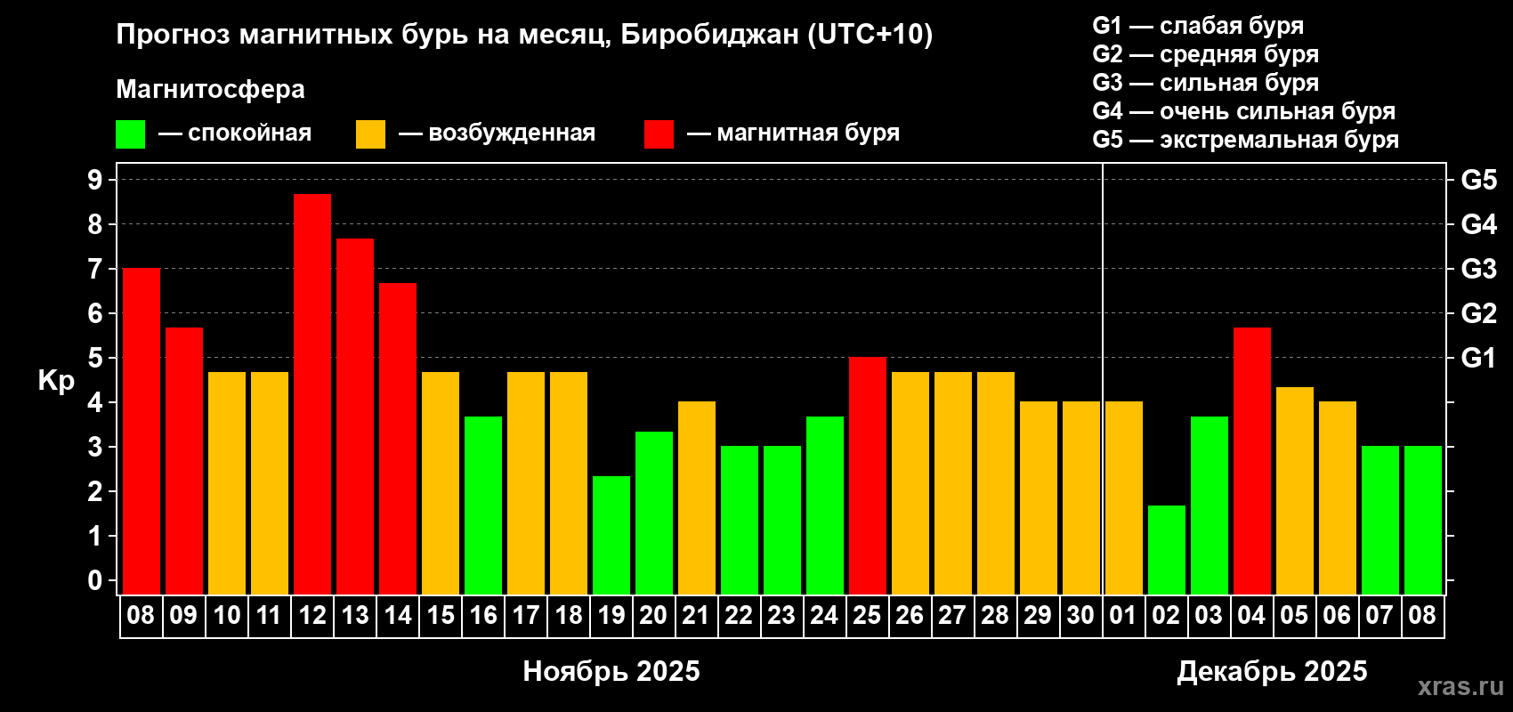 Прогноз магнитных бурь в Биробиджане — 8 ноября 2025 года