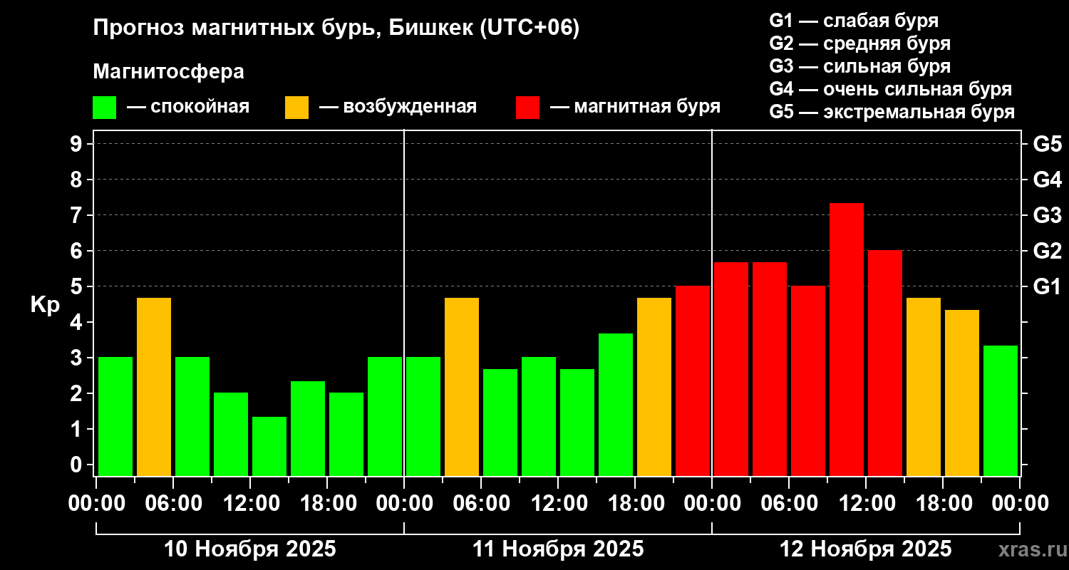 Прогноз магнитных бурь в Бишкеке — 10 ноября 2025 года