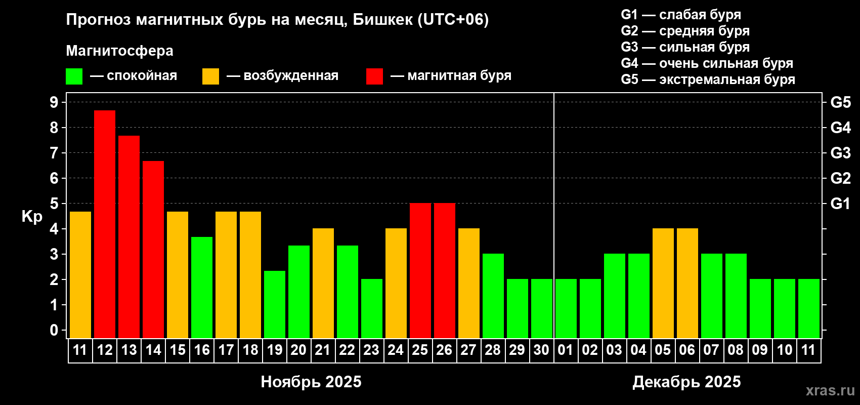 Прогноз магнитных бурь в Бишкеке — 11 ноября 2025 года