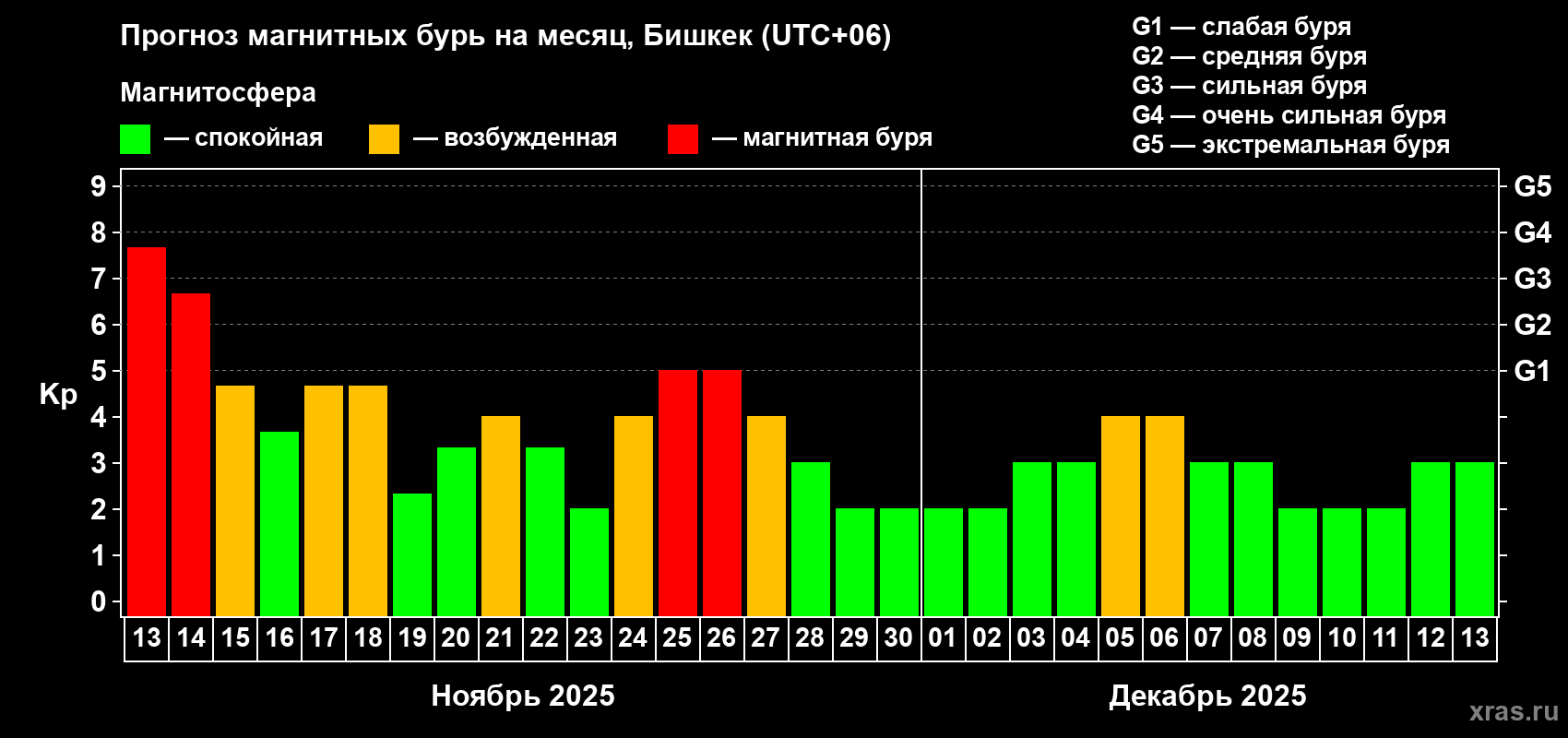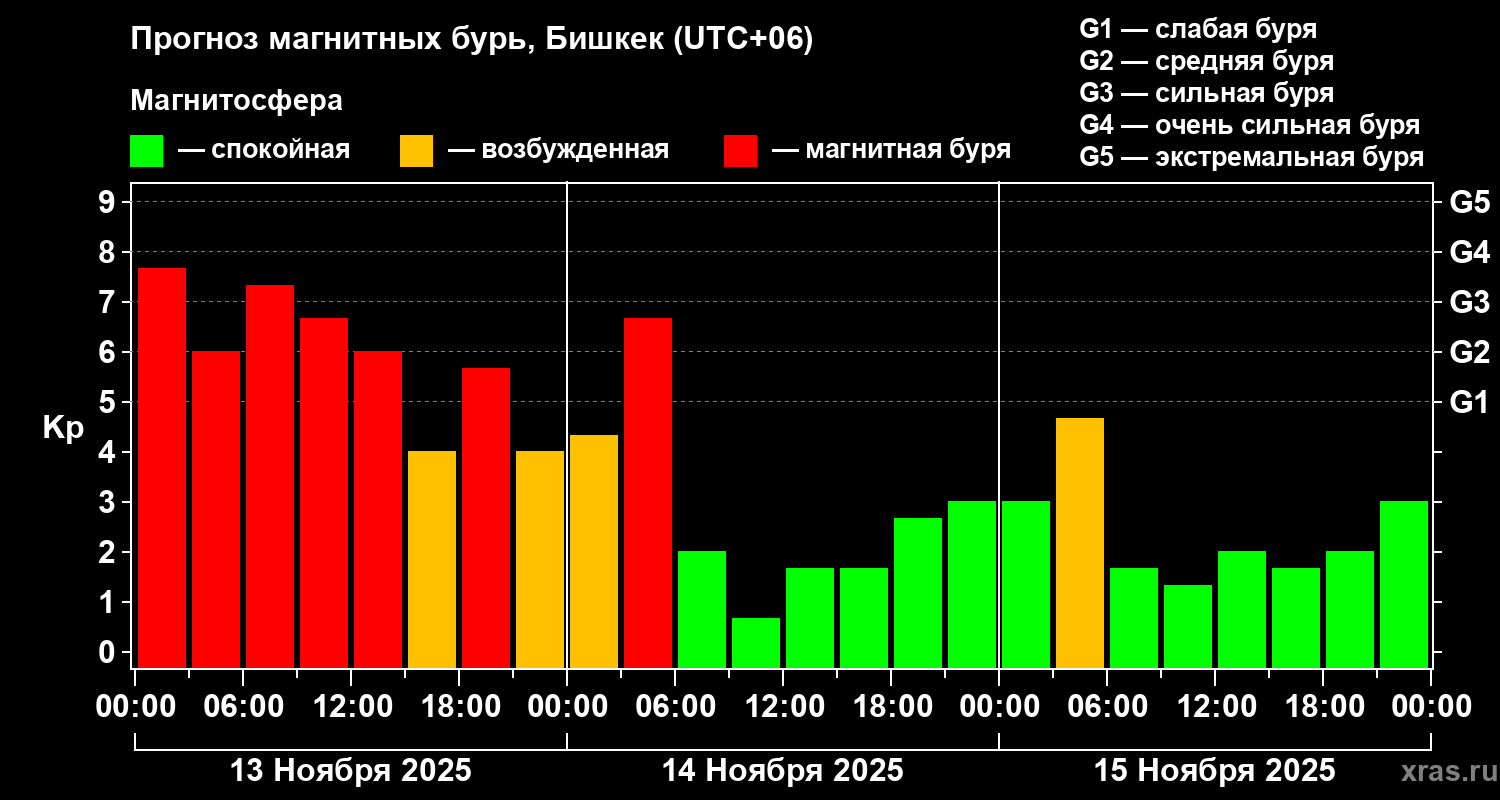 Прогноз магнитных бурь в Бишкеке — 13 ноября 2025 года