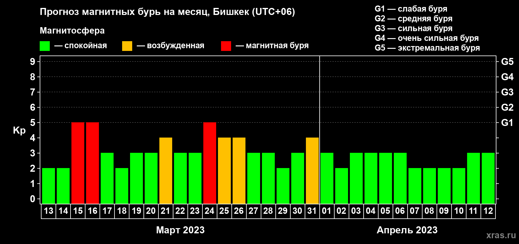 Прогноз магнитных бурь в Бишкеке — 13 марта 2023 года