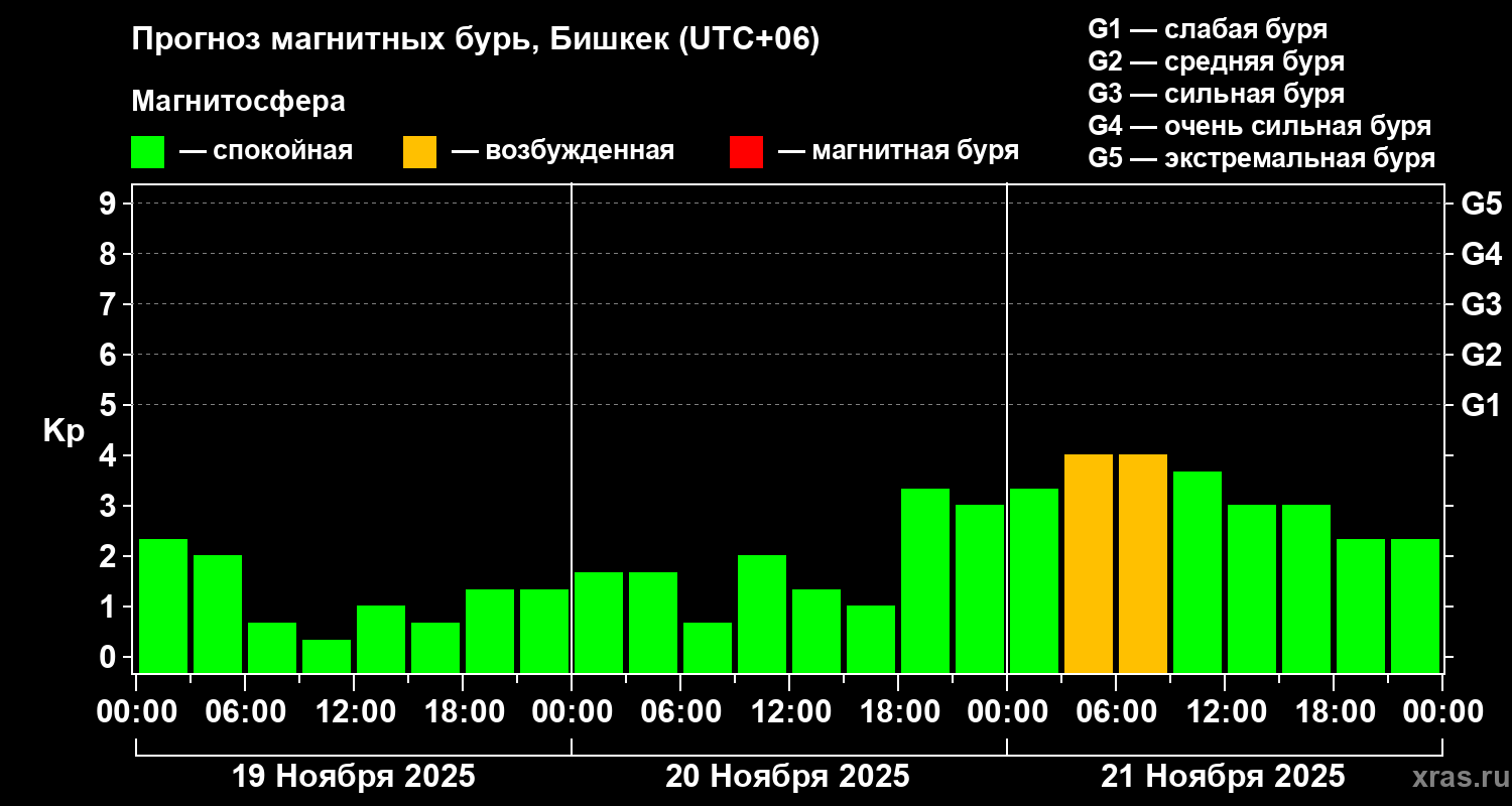Прогноз магнитных бурь в Бишкеке — 19 ноября 2025 года