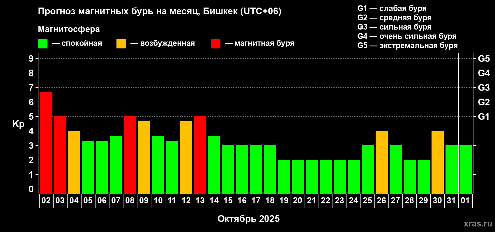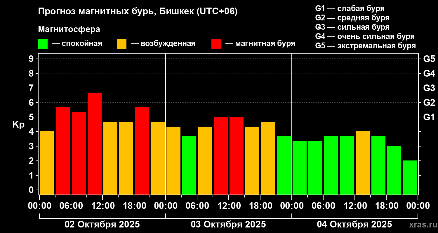 Прогноз магнитных бурь в Бишкеке — 2 октября 2025 года