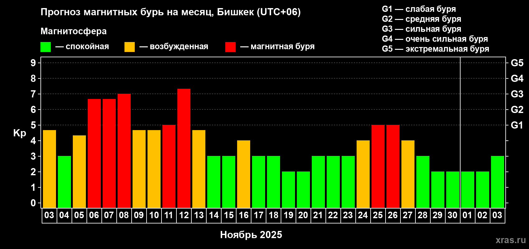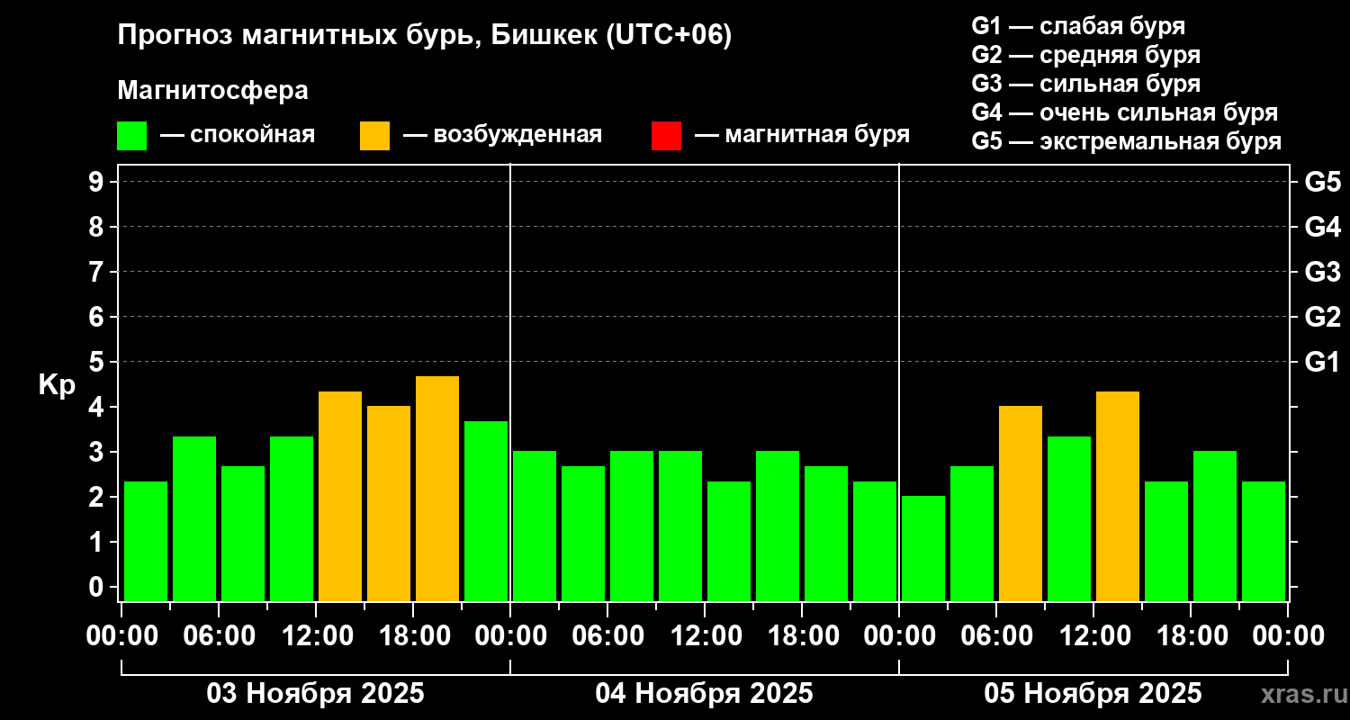 Прогноз магнитных бурь в Бишкеке — 3 ноября 2025 года