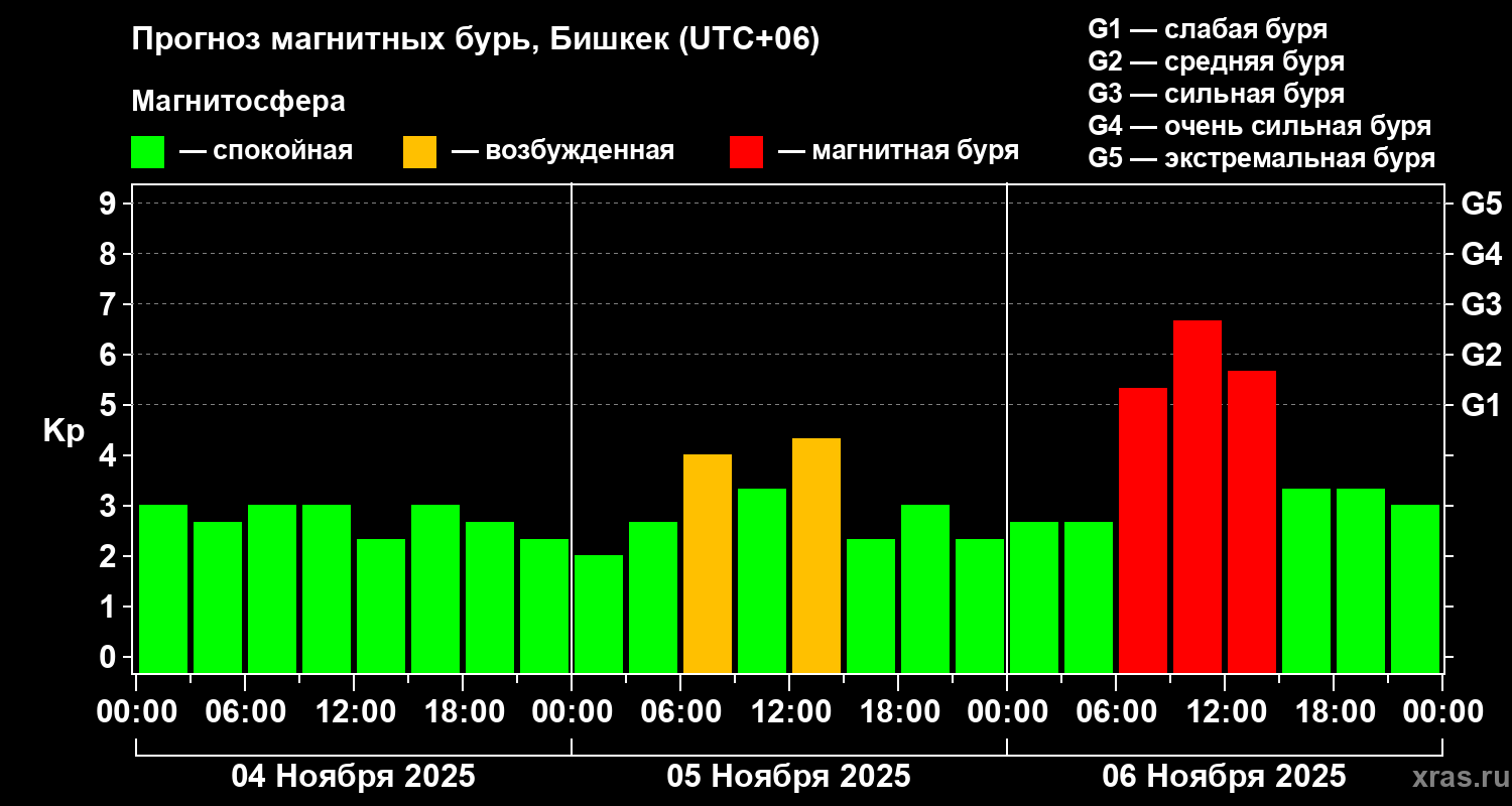 Прогноз магнитных бурь в Бишкеке — 4 ноября 2025 года