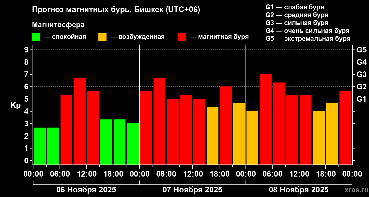 Прогноз магнитных бурь в Бишкеке — 6 ноября 2025 года