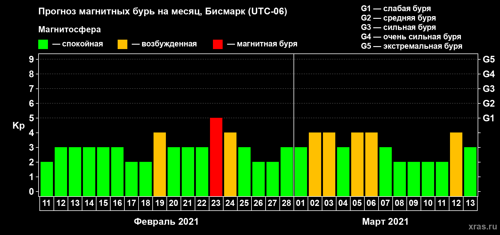 Прогноз магнитных бурь в Бисмарке — 11 февраля 2021 года