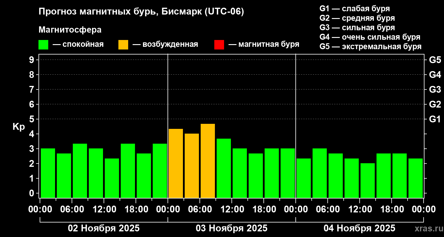 Прогноз магнитных бурь в Бисмарке на 2 ноября 2025 года